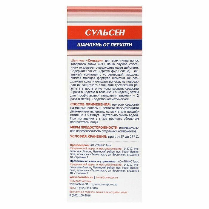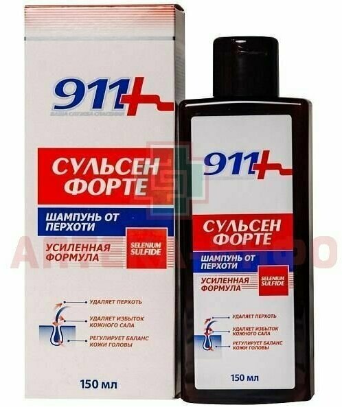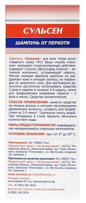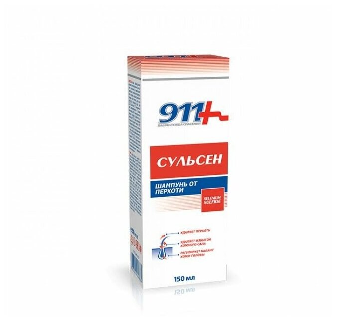 Шампунь «Сульсен» для всех типов волос товарного знака «911 Ваша служба спасения» оказывает отшелушивающее действие. Содержит Сульсен (Дисульфид Селена) – активный компонент, устраняющий перхоть. Мягкая моющая формула шампуня не раздражает кожу и очищает волосы, не повреждая их защитного слоя. Для достижения результата достаточно использовать средство 2 раза в неделю в течение 3-4 недель, затем для профилактики появления перхоти – 2 раза в месяц. Средство косметическое.