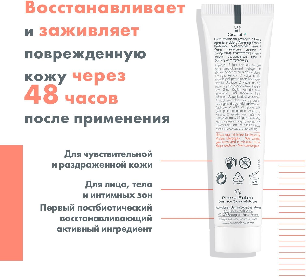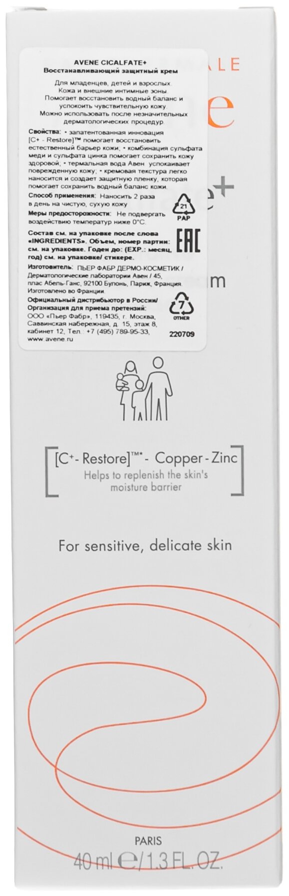 Восстанавливающий защитный крем Cicalfate+ для чувствительной, раздраженной и поврежденной кожи и слизистых младенцев, детей и взрослых. Восстанавливает и заживляет поврежденную кожу через 48 часов после применения, создавая эффект повязки*. Снимает раздражение и покраснение, защищает от повторного инфицирования. Восстанавливает кожу после незначительных дерматологических процедур. Одобрено Обществом детских дерматологов. Не имеет ограничения в использовании. Эффективность средств подтверждена международными клиническими исследованиями. Активные компоненты: • Инновационный компонент [С+ - Restore]™ помогает восстановить естественный защитный барьер кожи. • Комбинация сульфата меди и сульфата цинка помогает сохранить кожу здоровой, ограничивая распространение бактерий. • Обогащенный Термальной водой Avène крем успокаивает раздраженную и поврежденную кожу. • Кремовая текстура легко наносится и создает защитную пленку, сохраняющую водный баланс кожи. *Исследование на 253 пациентах под дерматологическим, педиатрическим и гинекологическим контролем, 2 применения в день в течение 21 дня.