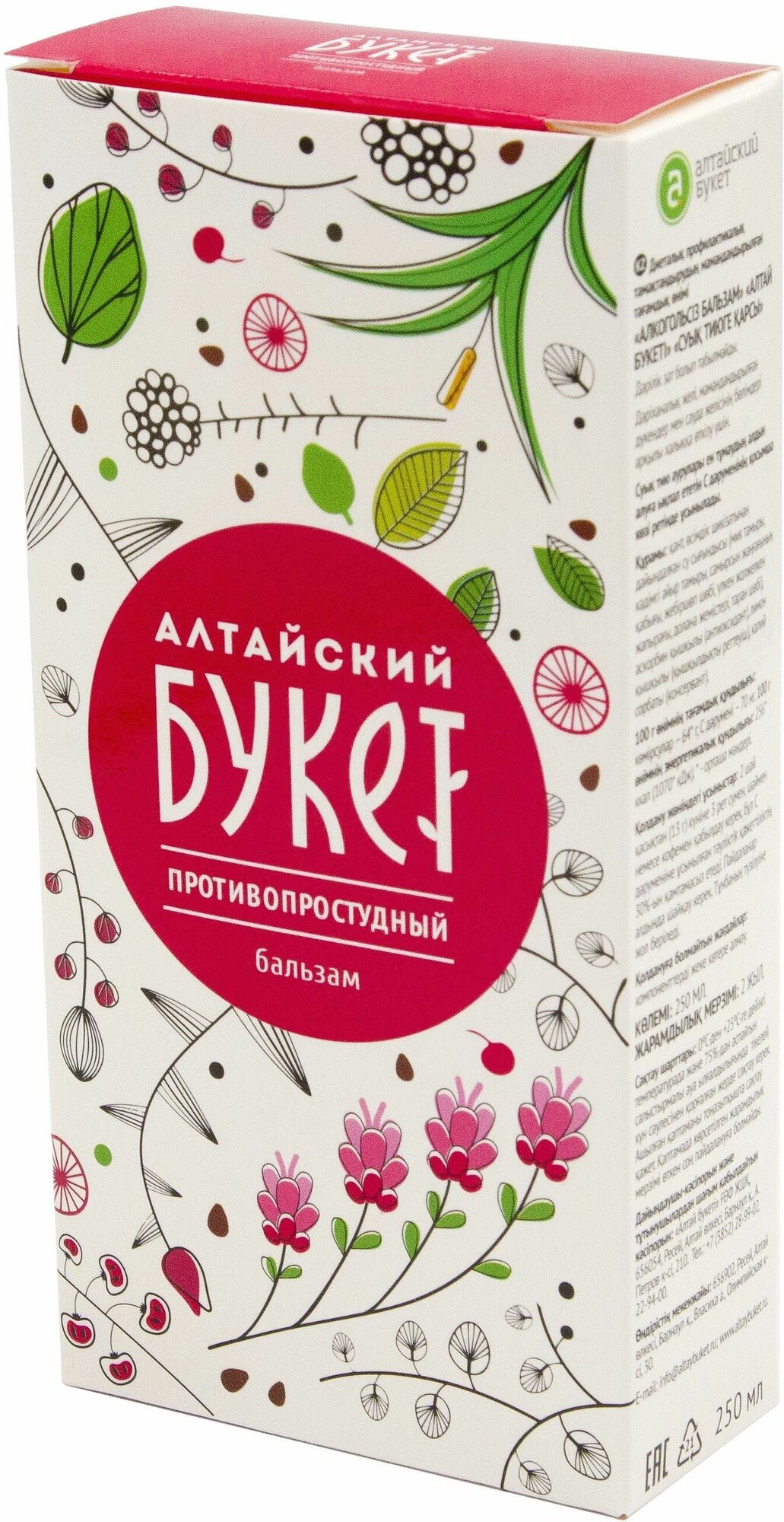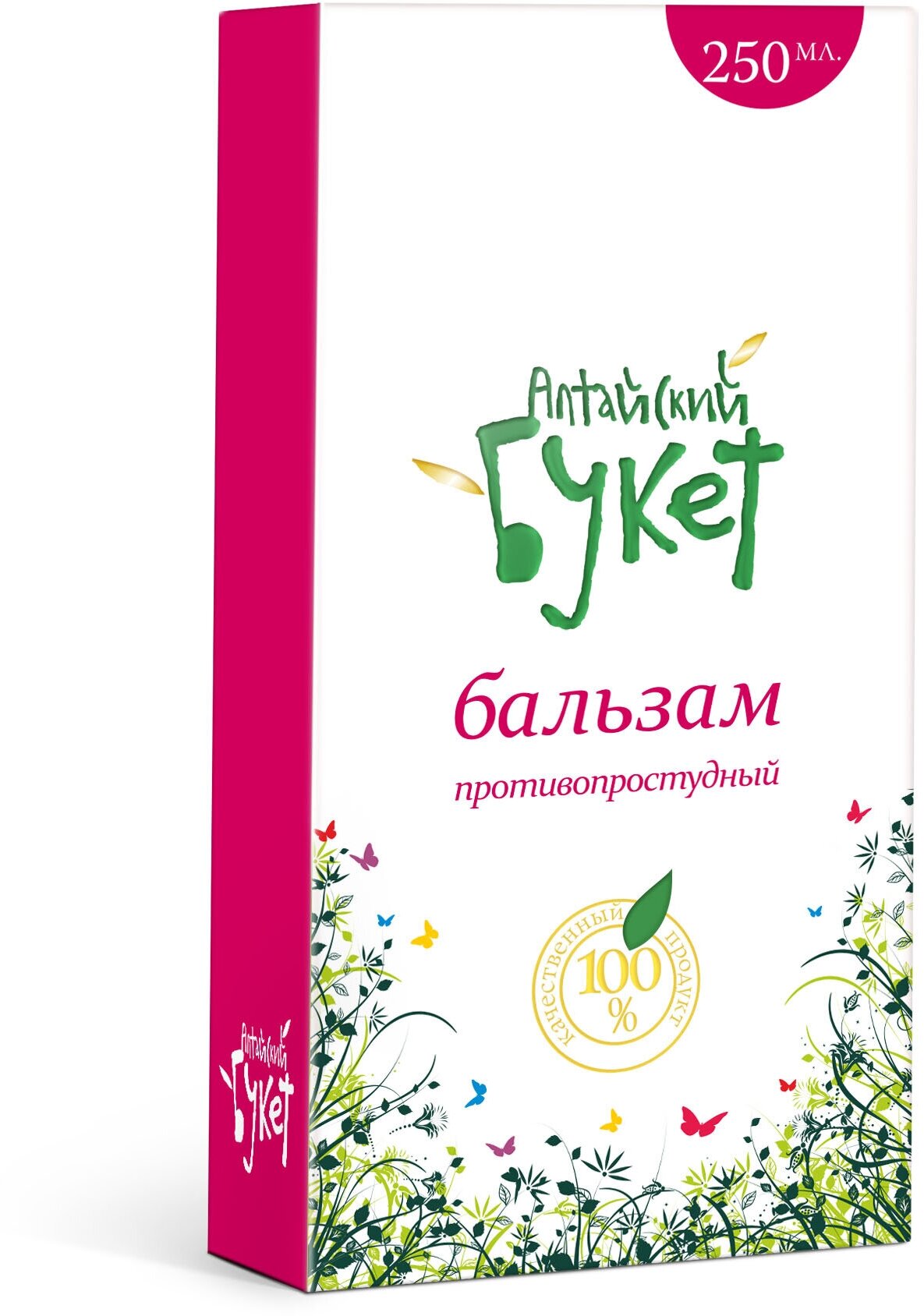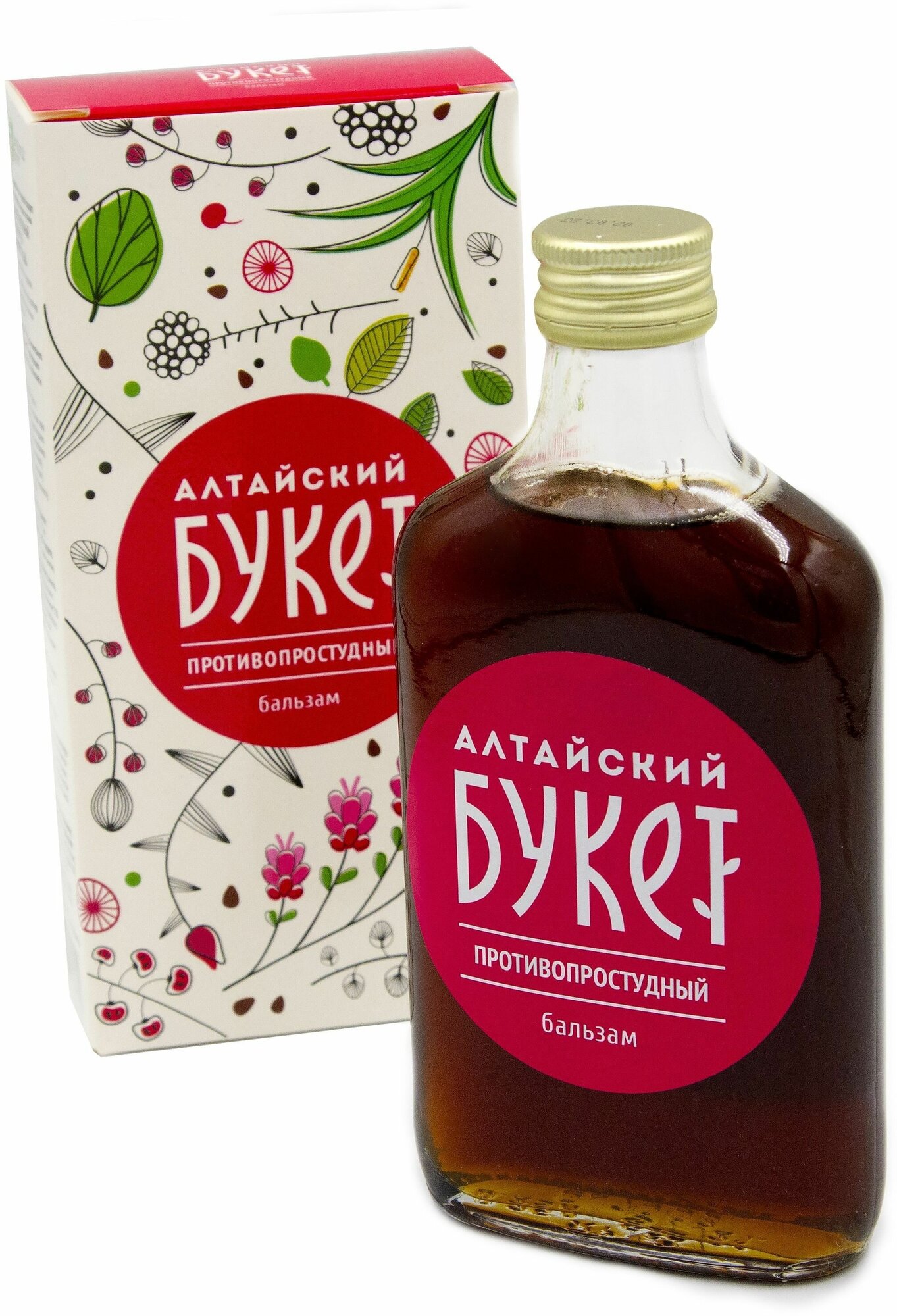СоставЭкстракты корня солодки, корня аира обыкновенного, скорлупы кедрового ореха, травы чабреца, листа подорожника, плодов боярышника, травы спорыша, аскорбиновая кислота, лимонная кислота, сахар, сорбат калия.ОписаниеНатуральные бальзамы серии «Алтайский букет» - уникальные средства направленного действия, состоящие из природных экологически чистых компонентов. Они не содержат красителей, ароматизаторов и химических веществ. Благодаря красивой упаковке и качественному содержанию бальзамы фирмы «Алтайский букет» могут стать отличным подарком для родных, близких и друзей. Простуда — это, казалось бы, банальное заболевание выбивает нас из привычного ритма жизни, и подчас может обернуться серьезными осложнениями. Лучшим способом оградить себя от простуды и гриппа, этих нежеланных «спутников» холодного времени года, является их профилактика. «Противопростудный» бальзам предупреждает осложнения простудных заболеваний, дезинфицирует и уменьшает воспаления. Он улучшает состояние верхних дыхательных путей, смягчает кашель и ускоряет выздоровление. Для укрепления иммунитета люди испокон веков принимали отвары целебных трав. Добавив «Противопростудный» бальзам в чай, вы сведете к минимуму риск простуды, гриппа и других заболеваний верхних дыхательных путей. Бальзам способствует отделению слизи и отходу мокроты при кашле, облегчает состояние при простудных и инфекционных болезнях, снижает частоту простудных заболеваний.Натуральные компоненты бальзама обладают противовоспалительными, жаропонижающими, противомикробными, иммуномодулирующими и общеукрепляющими свойствами. Бальзам "Противопростудный" помогает в краткие сроки избавиться от признаков инфекционных и простудных заболеваний, в результате выздоровление наступает значительно быстрее, а риск возникновения осложнений после перенесенного ОРВИ или гриппа сводится к минимуму. Входящий в состав бальзама корень солодки способствует отхождению мокроты из бронхов. Поэтому солодка результативно используется при терапии продолжительного сухого кашля при воспалении легких, тонзиллите, для регенерации голоса при воспалении гортани. Кроме того, солодка снимает спазмы в мышцах, нормализует работу сердца и сосудов, улучшает самочувствие при пониженном артериальном давлении. Аир известен благодаря своим противовоспалительным свойствам. Аир содержит множество лечебных веществ: камедь, крахмал, дубильные вещества, гликозиды. Подорожник не только прекрасно снимает воспаление, но и служит антисептиком, заживляет и затягивает раны, положительно влияет на секреторную функцию желудка, снимает боль, а также оказывает отхаркивающее и кровоочистительное действие. Его используют как мощное обезболивающее, противовоспалительное и антисептическое средство.Показания к применениюБальзам Противопростудный рекомендован при: ОРВИ гриппе простудах ослабленном иммунитете в период сезонных заболеваний.ПротивопоказанияИндивидуальная непереносимость компонентов.Способ применения и дозы1-2 чайные.