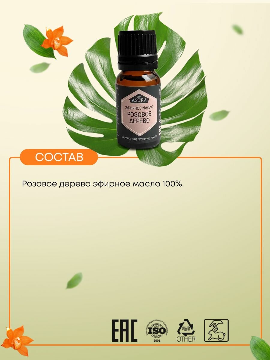 Розовое дерево - вечнозеленое тропическое дерево с твердой прочной древесиной розового цвета, которая считается одной из самых дорогих в мире. В настоящий момент растение занесено в международную Красную книгу, и добыча эфирного масла строго ограничена. Культивируется в Бразилии, Перу и во Французской Гвинее. Лечебно-профилактические свойства: Повышает иммунитет. Применяется для профилактики гриппа и ОРВИ. Нормализует жировой обмен, способствует выведению шлаков и снижению веса. Косметические свойства: Используется для ухода за жирной пористой кожей, при угревой сыпи. Обладает антицеллюлитным действием. Предупреждает появление растяжек кожи (стрий). Препятствует образованию камедонов (закрытых угрей). Разглаживает морщины. Улучшает цвет кожи. Используется для ухода за жирными волосами. Эмоциональное воздействие: Помогает объективно воспринимать жизнь и легко усваивать новый поток информации. Укрепляет нервную систему. Снимает чувство страха, раздражение. Дополнительные свойства: Снижает аппетит. Является натуральным дезодорантом.