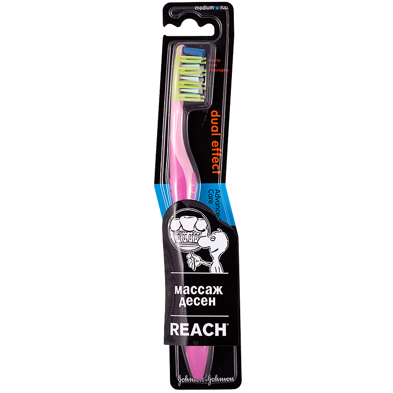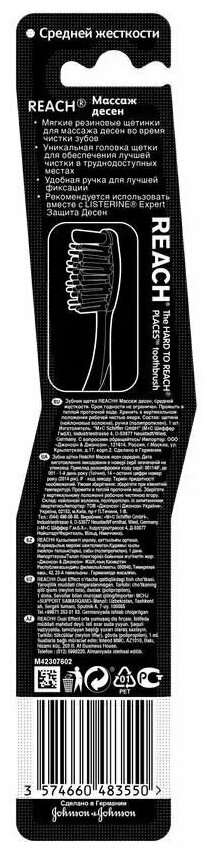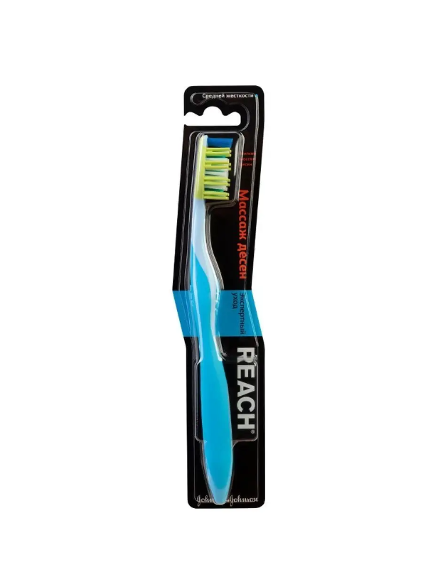 REACH "Массаж десен" - эффективная чистка и массаж десен. Мягкие резиновые щетинки массажируют десна во время чистки зубов. Специальная головка щетки имеет форму, обеспечивающую лучшую чистку в труднодоступных местах. Ручка с резиновой накладкой обеспечивает удобный захват и препятствуют скольжению в руке, обеспечивая максимальный контроль во время чистки. Рекомендуется использовать вместе с LISTERINE Expert Защита Десен. Разноуровневая щетина крестообразной формы обеспечивает эффективную очистку межзубных пространств. После использования промыть в теплой проточной воде. Хранить в вертикальном положении рабочей частью вверх.