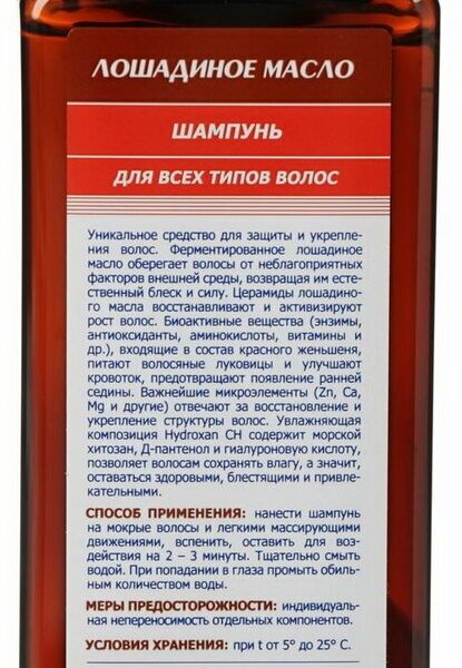 Уникальное средство для защиты и укрепления волос. Ферментированное лошадиное масло оберегает волосы от неблагоприятных факторов внешней среды, возвращая им естественный блеск и силу. Церамиды лошадиного масла восстанавливают и активизируют рост волос. Биоактивные вещества (энзимы, антиоксиданты, аминокислоты, витамины и др.), входящие в состав красного женьшеня, питают волосяные луковицы и улучшают кровоток, предотвращают появление ранней седины. Важнейшие микроэлементы (Zn, Ca, Mg и другие) отвечают за восстановление и укрепление структуры волос. Увлажняющая композиция Hydroxan CH содержит морской хитозан, Д-пантенол и гиалуроновую кислоту, позволяет волосам сохранять влагу, а значит, оставаться здоровыми, блестящими и привлекательными.