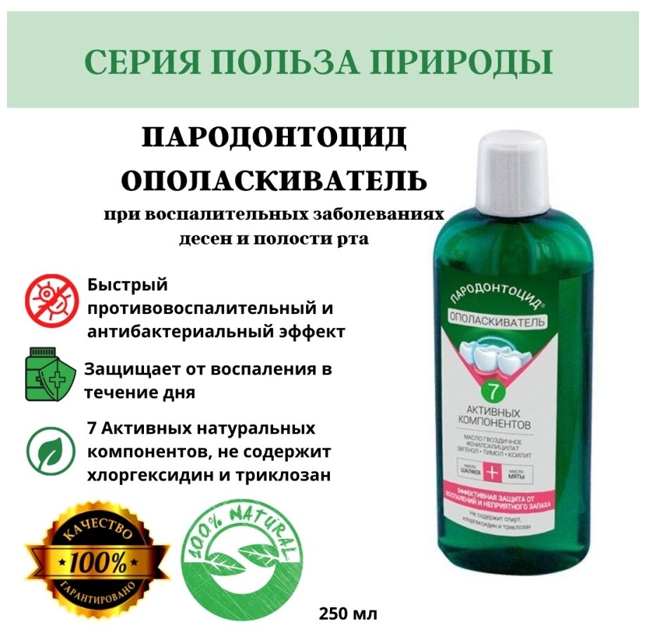 Эффективная защита от воспалений и неприятного запаха. Индивидуальная непереносимость компонентов состава. Вода, пропиленгликоль, глицерин, ПЭГ-40 гидрогенизированное касторовое масло, 1,2-гександиол, фенилсалицилат, масло эфирное мускатного шалфея (Oleum salvie sciareae), масло эфирное мяты перечной (Oleum piperitae), эвгенол, тимол, масло эфирное гвоздичное (Oleum caryophylli), ксилит, лимонная кислота, метилпарабен натрия.\ Пародонтозид - ополаскиватель для полости рта, улучшает состояние десен и слизистой оболочки полости рта, в т. ч. при ношении зубных протезов и ортодонтических конструкций (брекетов), устраняет причины неприятного запаха изо рта. Это эффективное средство, которое содержит уникальный комплекс из 7 активных компонентов и обеспечивает максимальную защиту при кровоточивости и воспалении десен и слизистой оболочки полости рта. Он также рекомендован для использования после хирургических вмешательств и имплантации зубов. Легко использовать: наполнить мерный колпачок ополаскивателем до метки 10 мл (без разведения). Полоскать 2-4 раза в день после чистки зубов и/или приема пищи. Полоскать не менее 1 минуты. Не глотать. Не рекомендуется полоскать рот водой, а так же принимать пищу и жидкости в течение 30 минут после процедуры. При желании можно развести ополаскиватель водой в отношении 1:1. Отличное решение для качественного ухода за зубами и полостью рта!7 Активных компонентов - масло гвоздичное, фенилсалицилат, эвгенол, тимол, ксилит, масло шалфея, масло мятыНе содержит спирт, хлоргексидин и триклозанПародонтоцид® ополаскиватель для полости рта улучшает состояние десен и слизистой оболочки полости рта, в т. ч. при ношении зубных протезов и ортодонтических конструкций (брекетов), устраняет причины неприятного запаха изо рта. Пародонтоцид® содержит уникальный комплекс из 7 активных компонентов и обеспечивает максимальную защиту при кровоточивости и воспалении десен и сизистой оболочки полости рта. Средство гигиены полости рта. Способ приминения. Наполнить мерный колпачок ополаскивателем до метки 10 мл (без разведения). Полоскать 2-4 раза в день после чистки зубов и/или приема пищи. Полоскать не менее 1 минуты. Не глотать. Не рекомендуется полоскать рот водой, а так же принимать пищу и жидкости в течение 30 минут после процедуры. При желании можно развести ополаскиватель водой в отношении 1:1. Для достижения максимального эффекта рекомендуется применять ополаскиватель вместе с другими средствами серии Пародонтоцид® (зубная паста, гель, спрей, раствор). Без рецепта.