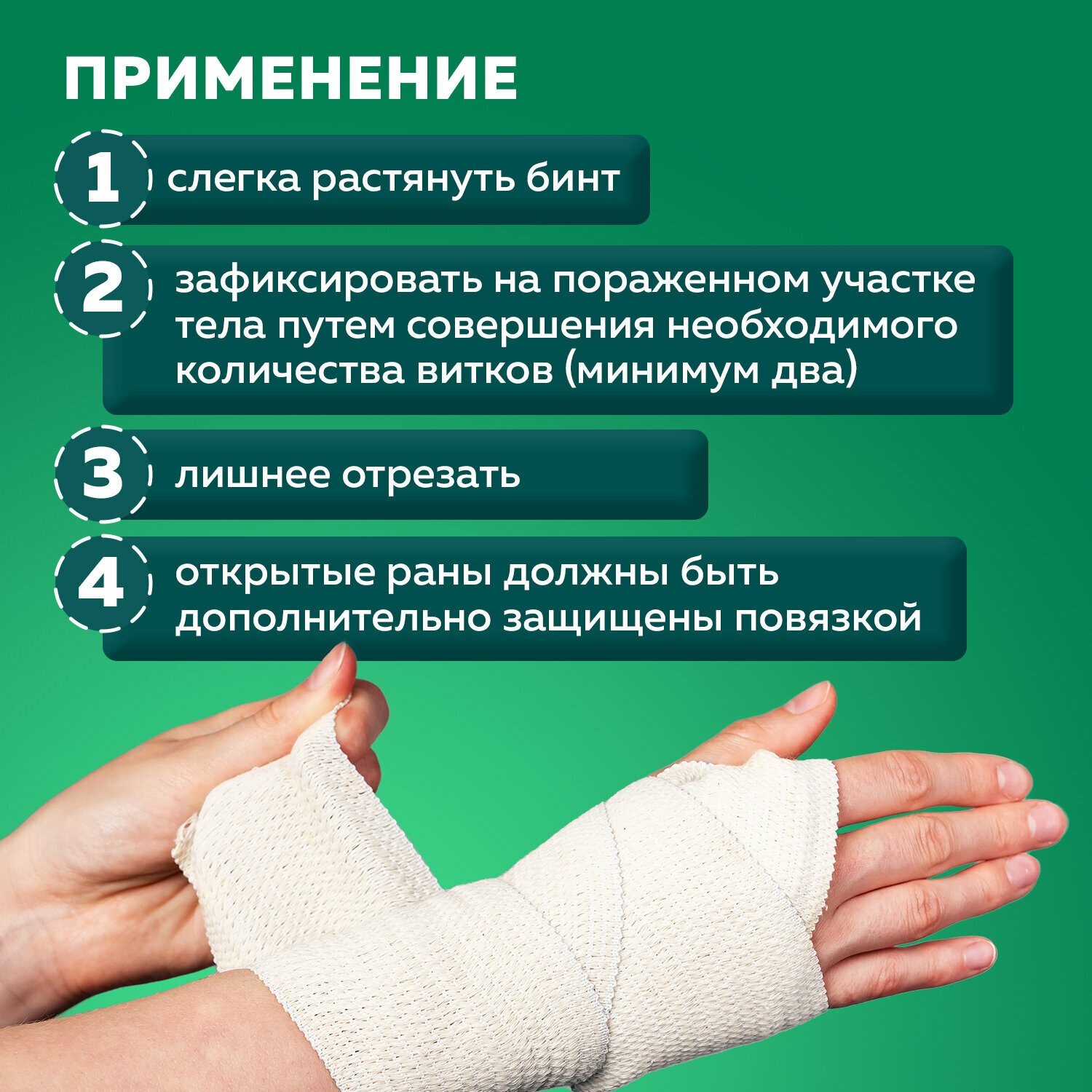 Бинт когезивный (самофиксирующийся) обеспечивает надежную фиксацию на длительный срок, бинт не приклеивается к коже, волосам и одежде, не раздражает кожу и не требует завязывания благодаря особой структуре поверхности бинта, позволяющей последующему слою цепляться за предыдущий. Предназначен для фиксирующих повязок всех видов в особенности на суставах, а также частях тела, имеющих коническую или округлую форму. Идеально подходят для закрепления марлевых салфеток, повязок, компрессов, для фиксации различных медицинских устройств (трубок, катетеров, электродов, шин) и повязок. Также применяется в качестве поддерживающего бинта для сухожилий, связок при мышечной боли, при растяжениях, повреждениях опорно-двигательного аппарата, в том числе повреждений сухожилий, вывихах, связок, при мышечной боли, для защиты ран от попадания грязи, при спортивных травмах, а также в качестве спортивного бандажа.