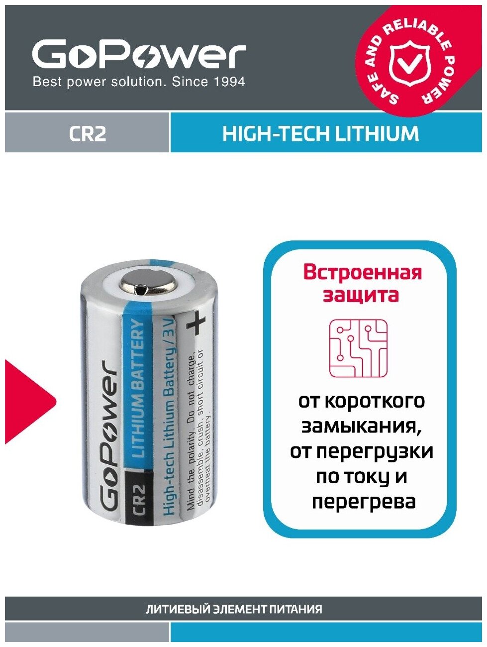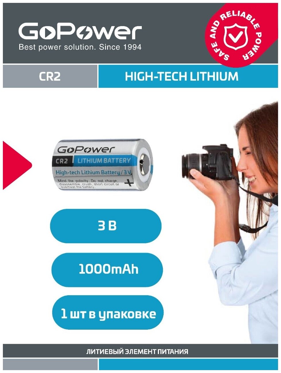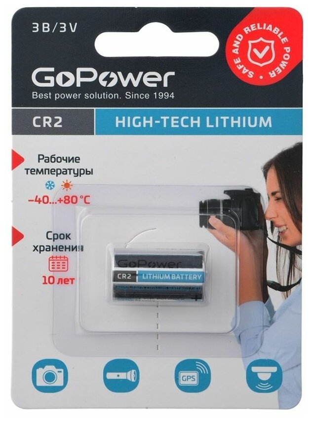 Литиевый элемент питания GoPower идеально подойдет для фототехники, медицинских приборов, фонарей. Положитесь на бесперебойную работу Ваших электронных устройств вместе c батарейкой Вы будете уверены, что Ваш фотоаппарат не выключится в ответственный момент, а сделает самые лучшие кадры.