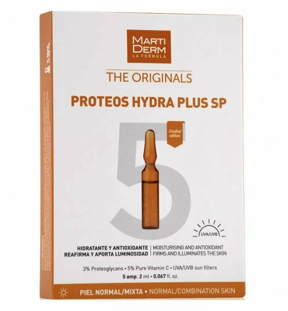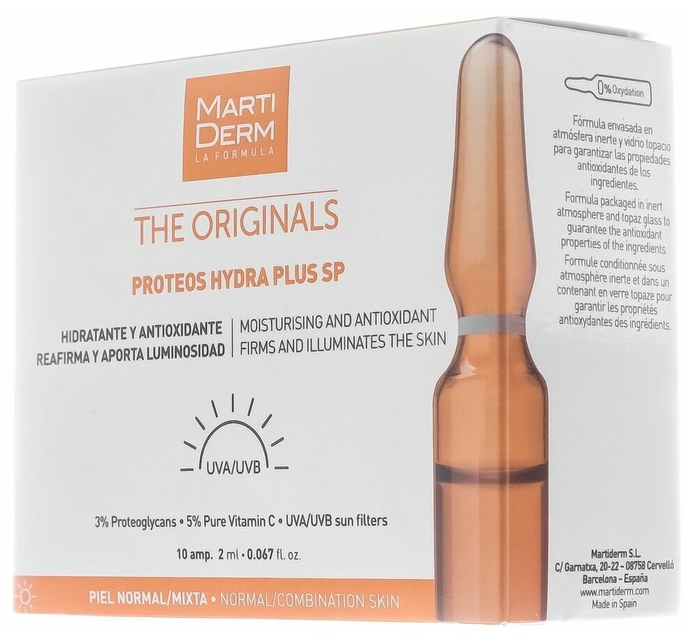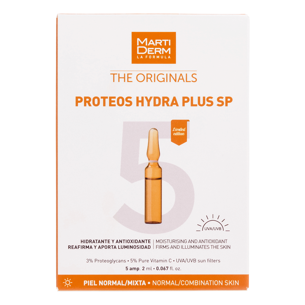 Martiderm The Originals Proteos Hydra Plus SP-это легкая сыворотка в индивидуальных ампулах, которая мгновенно увлажняет кожу и делает ее ярче с течением времени. С чистым витамином С и протеогликанами, а также защитой от солнца. Martiderm The Originals Proteos Hydra Plus SP осветляет и глубоко увлажняет кожу с момента ее нанесения. С протеогликанами для увлажнения кожи и чистым витамином С, чтобы получить антиоксидантный эффект и анти UVA/UVB радиационной защитой, чтобы полностью защитить кожу. Жидкая текстура очень легко впитывается и мгновенно оставляет кожу гладкой, но без каких-либо жирных ощущений. Ранее называлась Martiderm Proteoglicanos FPS.