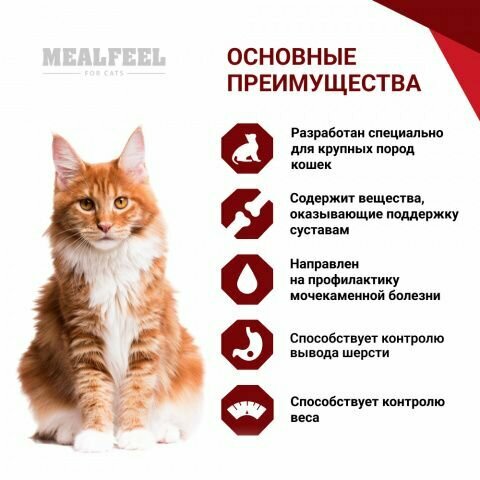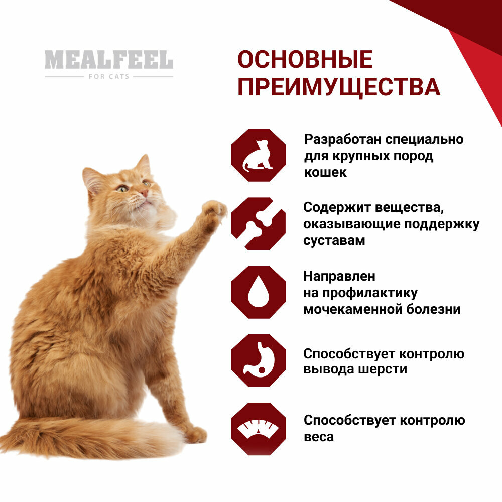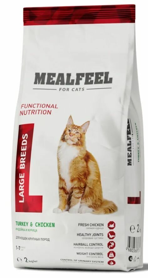 Mealfeel Large Breeds корм, разработанный специально для крупных пород кошек.Поддержка опорно-двигательной системы, особо чувствительной у кошек крупных пород: входящие в состав глюкозамин и хондроитин оказывают мощную поддержку суставам.Контроль веса: аминокислота L-карнитин способствует расщеплению жиров, а диетические курица и индейка насытят организм протеинами.Омега-3 улучшает состояние шерсти и кожных покровов.Естественное выведение шерсти из организма благодаря оптимальному соотношению клетчатки и инулина.Профилактика мочекаменной болезни: поэтому подходит всем кошкам крупных пород стерилизованным и кастрированным, а также тем, у кого не было подобных операций.Юкка Шидигера снижает неприятный запах экскрементов.Преимущества:Высокое содержание ингредиентов животного происхождения (мин.67%).Контроль вывода шерсти.Контроль веса (L-карнитин улучшает процесс расщепления жиров).Профилактика мочекаменной болезни.Высокое качество ингредиентов.Профилактика заболеваний суставов.Низкое содержание злаковых.Натуральные антиоксиданты.