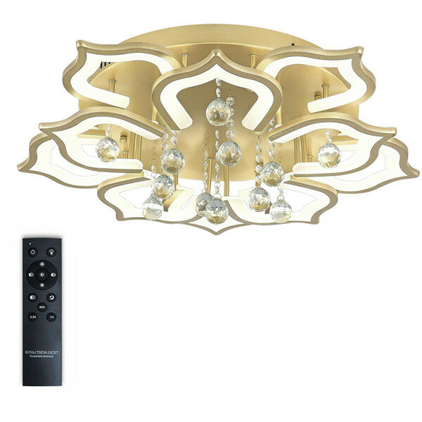 Светодиодный светильник с дистанционным управлением через пульт ДУ, смартфон, планшет. Лицевую часть составляют равноудалённые друг от друга рожки с симметричным дизайнерским узором, выполненные из акрила и располагающиеся на двух уровнях. Это обеспечивает отличное и равномерное рассеивание света. Стеклянные подвески эффектно преломляют свет, дополняя данную модель. Дизайн люстры выполнен в современном стиле в золотом цвете и отлично подойдёт в любой интерьер. Люстра имеет тёплый, естественный и холодный свет с регулировкой температуры свечения. Обладает плавной настройкой яркости в диапазоне от 10% до 100%. Имеется режим ночника и таймер отключения. Кроме того, от стандартного выключателя люстра имеет 4 режима свечения. Данные функции делают светильник оптимальным в процессе использования. Общая мощность 160W со световым потоком 12800 lm позволяет осветить до 25 кв. м. Он прост в сборке, установке и экономичен в обслуживании. Светодиоды легко заменимы в случае перегорания. Люстра подойдёт для всех видов потолков. Цветовая температура настраивается от 3200 до 6500 K. Степень защиты 20 IP.