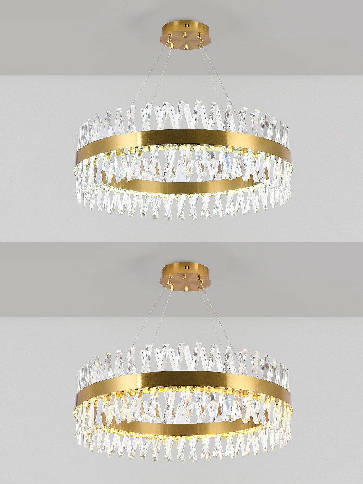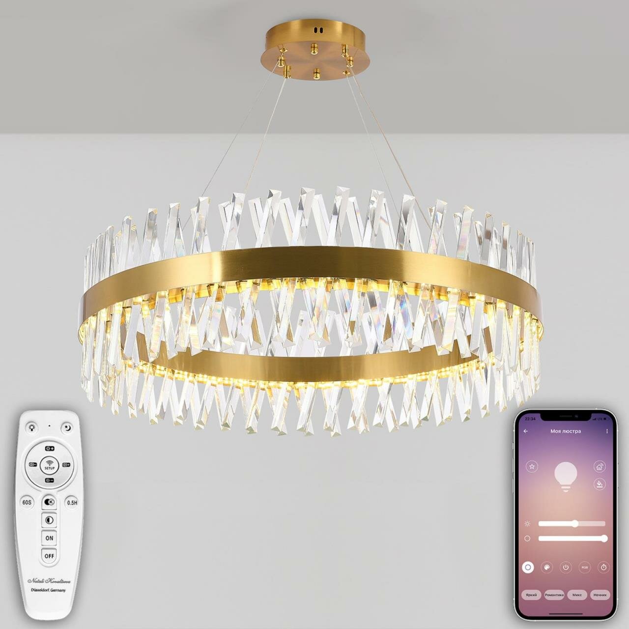 Современный светодиодный светильник нимб украсит любое помещение за счёт инновационного дизайна и большой функциональности. Светильник имеет кольцеобразную форму диаметром в 80 см. По периметру располагается гранённый хрусталь, который придаёт изысканности и подчеркивает стилистику. Высота люстры регулируется. Также люстра оснащена дистанционным управлением через пульт ДУ, смартфон, планшет. Люстра имеет тёплый, естественный и холодный свет с регулировкой температуры свечения. Обладает плавной настройкой яркости в диапазоне от 10% до 100%. Имеется режим ночника и таймер отключения. Кроме того, от стандартного выключателя люстра имеет 4 режима свечения. Данные функции делают светильник оптимальным в процессе использования. Общая мощность 160W со световым потоком 10500 lm позволяет осветить до 30 кв. м. Он прост в сборке, установке и экономичен в обслуживании. Светодиоды легко заменимы в случае перегорания. Люстра подойдёт для всех видов потолков. Цветовая температура настраивается от 3200 до 6500 K. Степень защиты 20 IP.