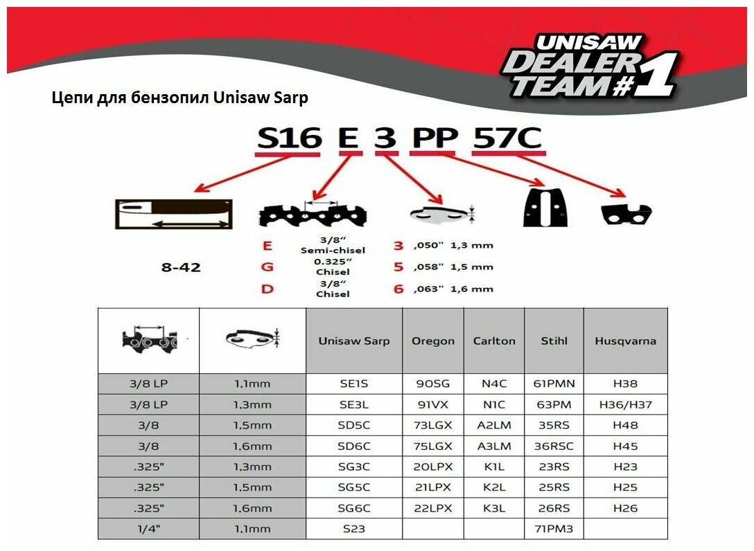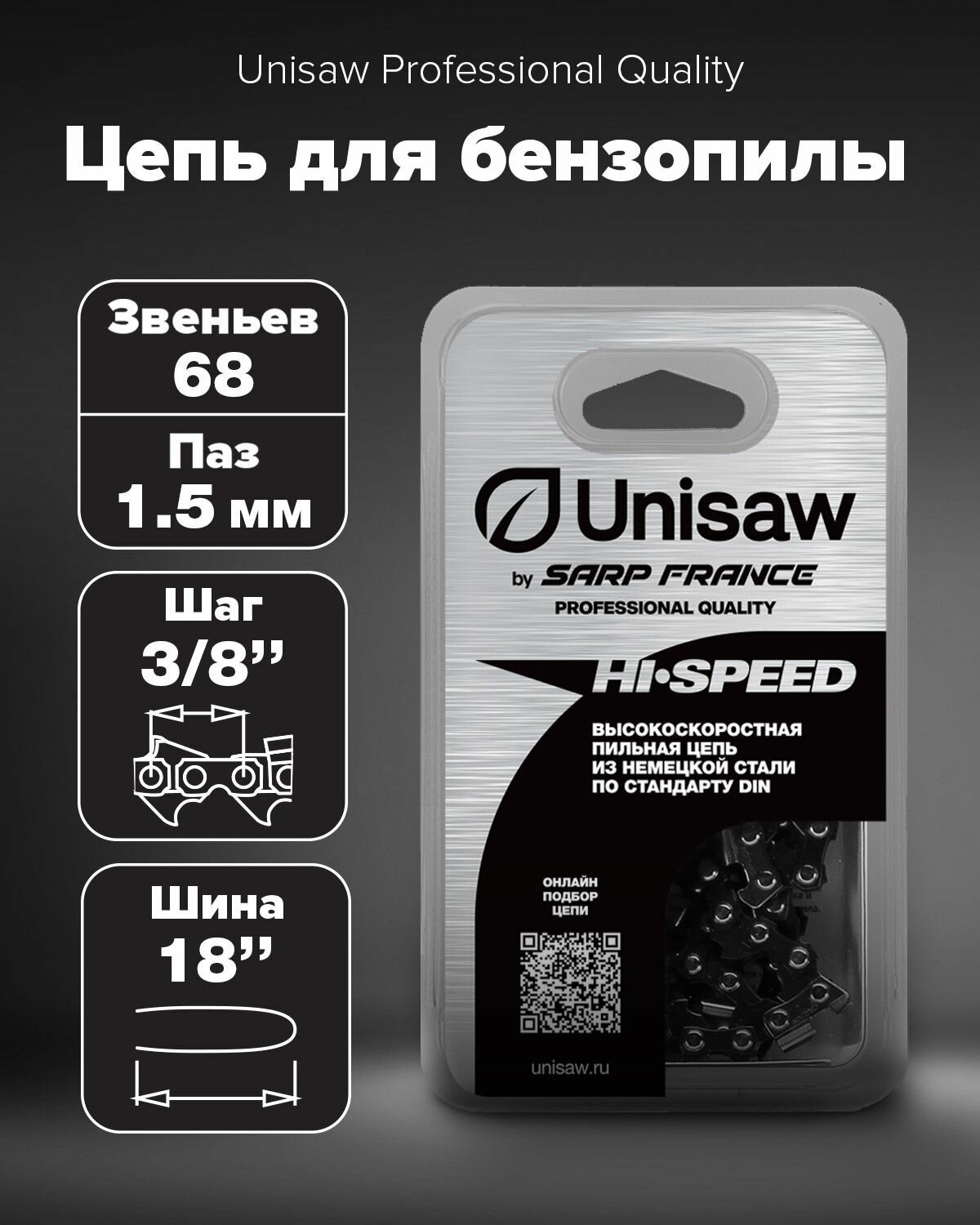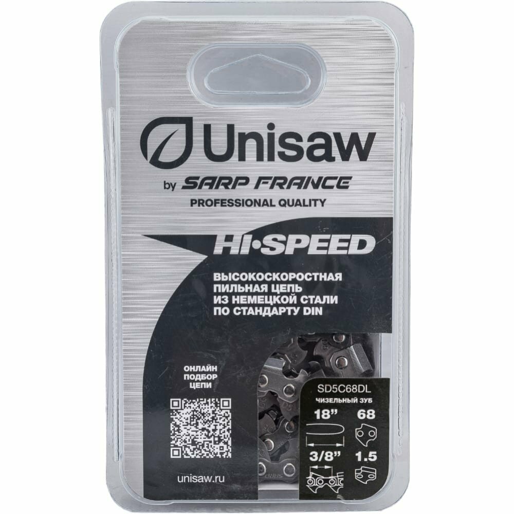 Пильная цепь Unisaw Professional Quality SD5C68DL - профессиональная высокоскоростная режущая цепь длиной 18", шагом 3/8" и толщиной направляющего звена 1,5 мм (68 звеньев), с чизельным профилем режущего зуба. Звенья цепей изготовлены из высококачественной легированной никелевой стали по стандарту DIN (Германия), это гарантирует высокую износостойкость и длительный срок службы в любых климатических условиях.