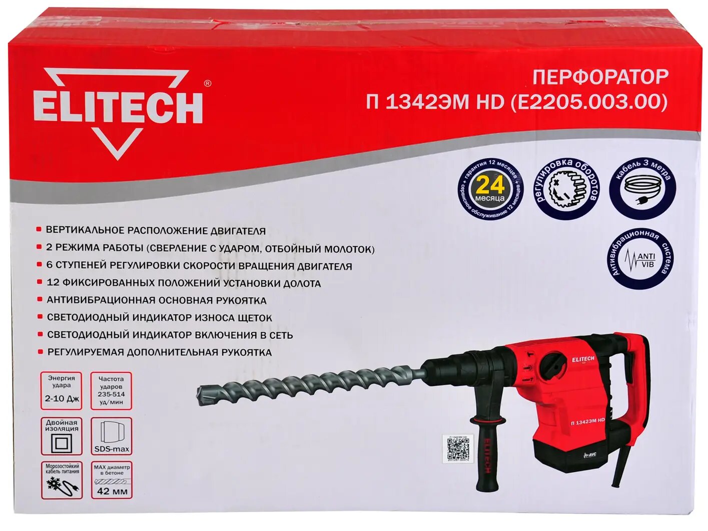 Перфоратор Elitech П 1342ЭМ HD SDS-maxAVC1300Вт42мм E2205.003.00 П 1342ЭМ HD (E2205.003.00)