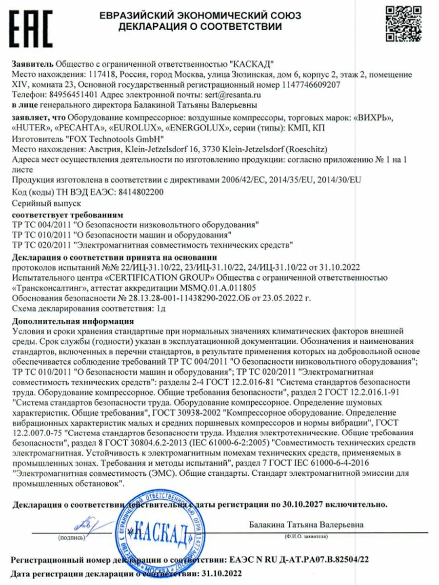 | Тип инструмента | Компрессор воздушный |