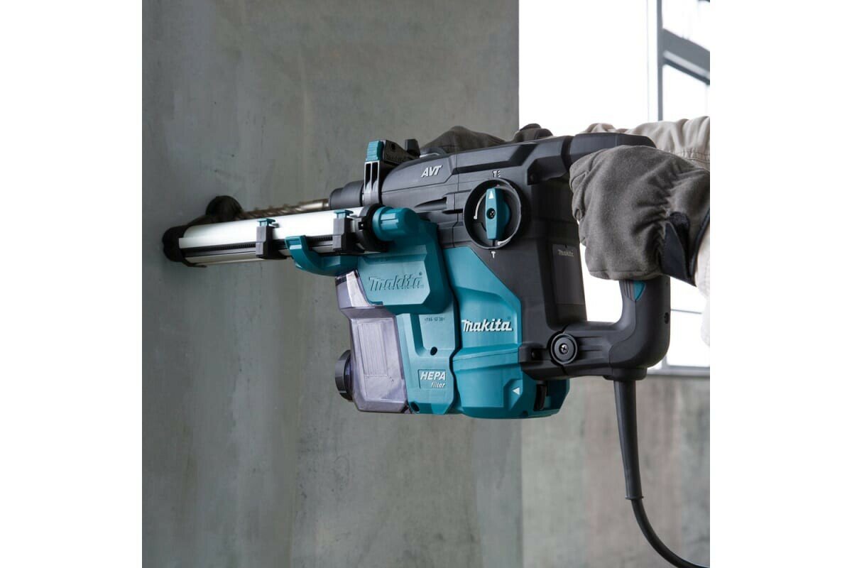 Трехрежимный перфоратор 30 мм с технологией гашения вибрации (AVT). Перфоратор Makita HR3011FCJ предназначен для сверления прочных материалов, 3 режима для работы по дереву, металлу, бетону и кирпичу. За счет вертикального расположения двигателя перфоратор имеет небольшие габариты корпуса.