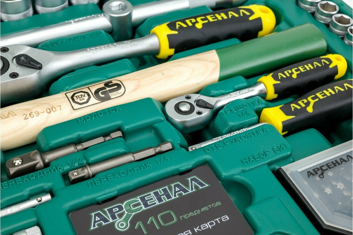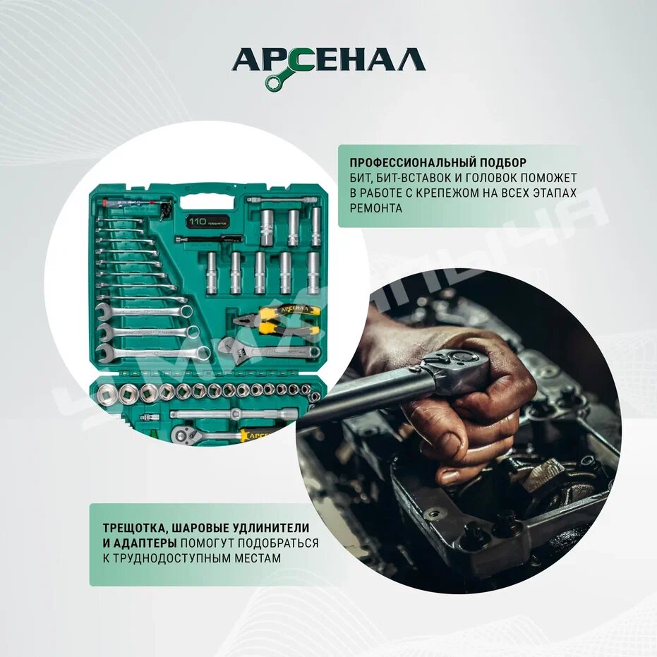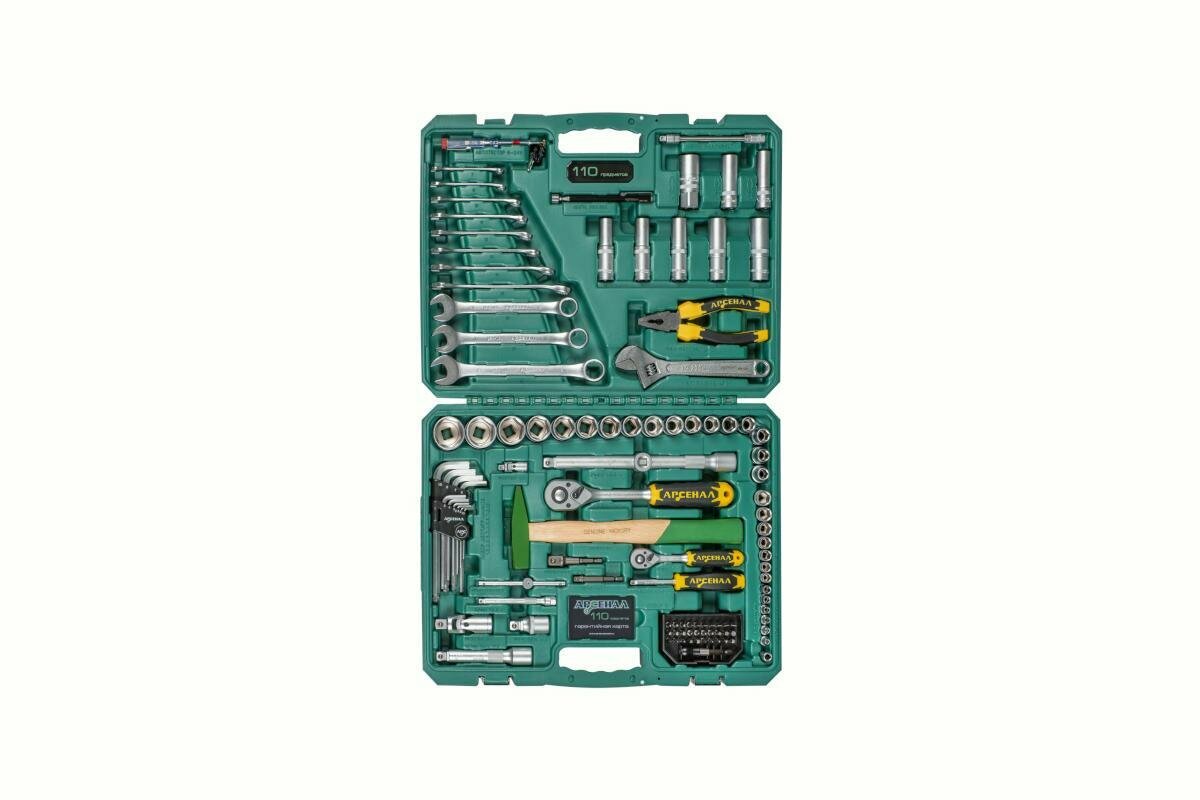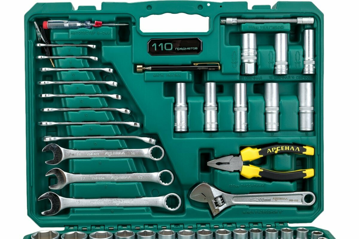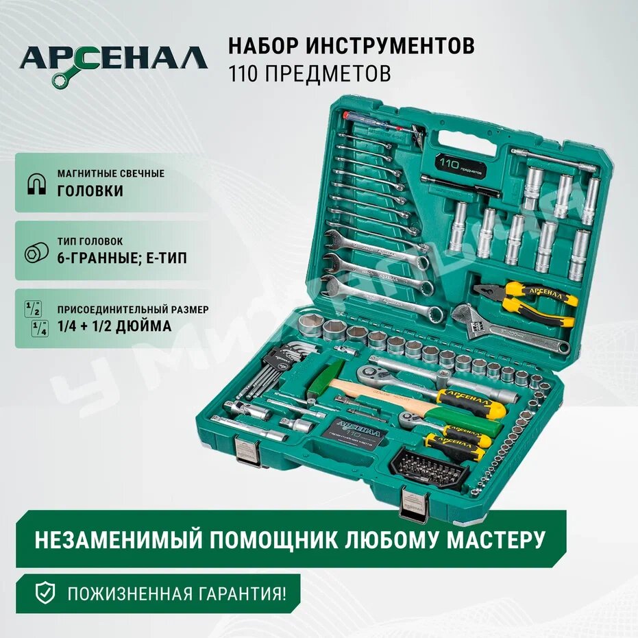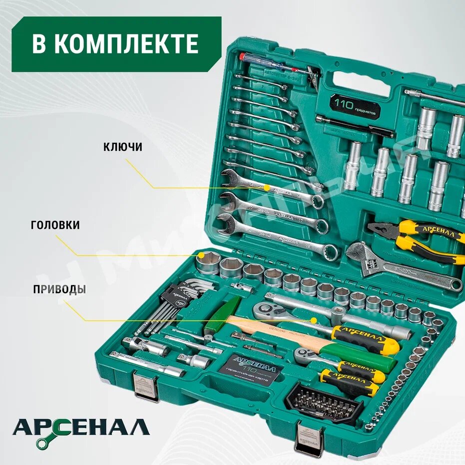 Набор инструментов 110 предметов © Арсенал, отличный вариант для профессионалов, расширенная комплектация головок, в том числе глубоких. Большой подбор ключей комбинированных и шестигранных, а еще разводной ключ в качестве ответного. В первую очередь, должны обратить свое внимание на этот набор те, кто хочет иметь большую комплектацию с отличными возможностями самостоятельного ремонта любых улов и агрегатов авто. Биты идут в отдельном кейсе - сложно потерять, удобно переносить. Сталь, из которой изготовлен инструмент, легирована хромом и ванадием с нанесением никелевого покрытия. Крепкий кейс с металлическими углами выдержит ударные нагрузки. Наборы инструментов Арсенал имеют пожизненную гарантию. Арсенал - всегда качественный инструмент и надежные кейсы.