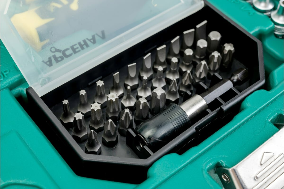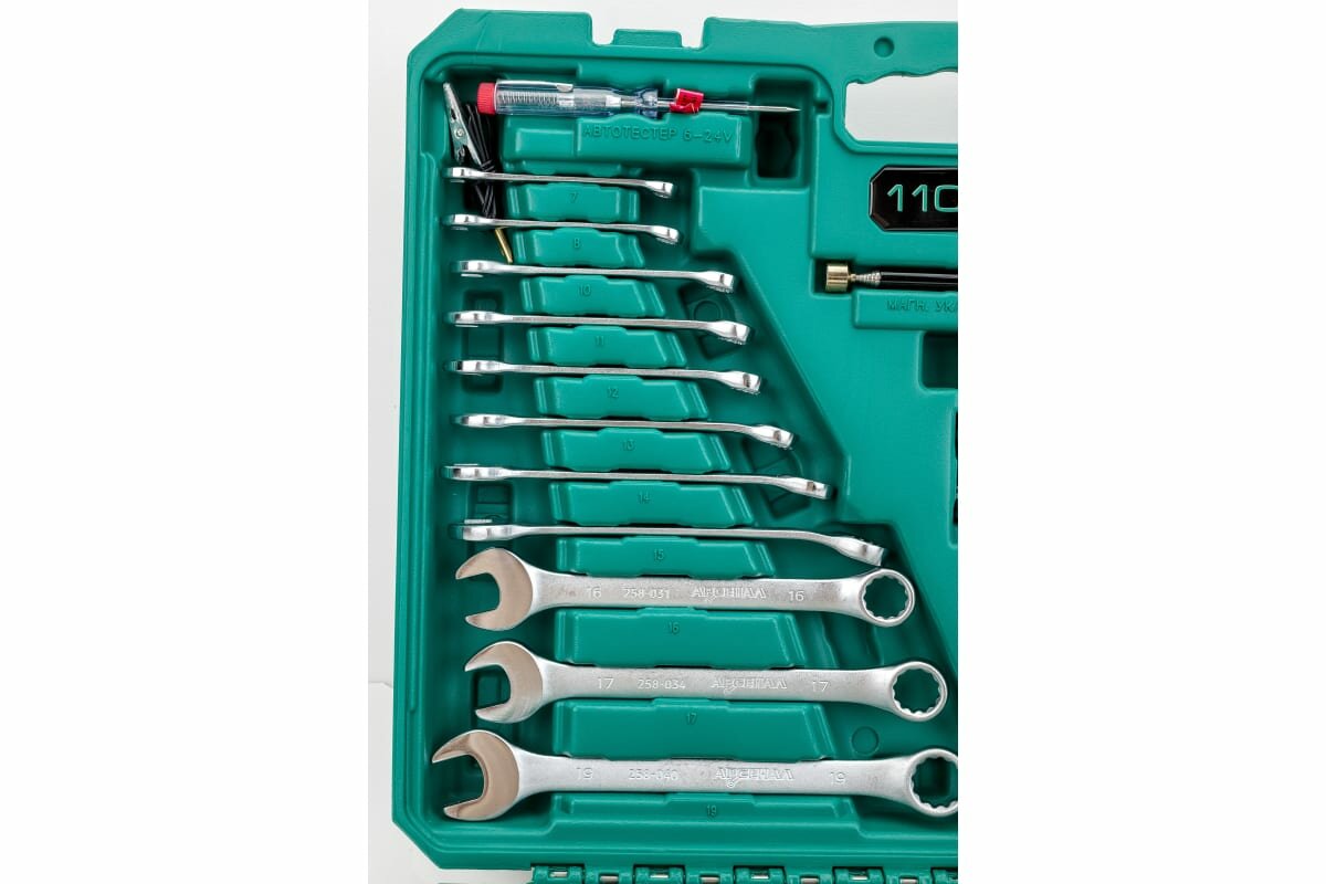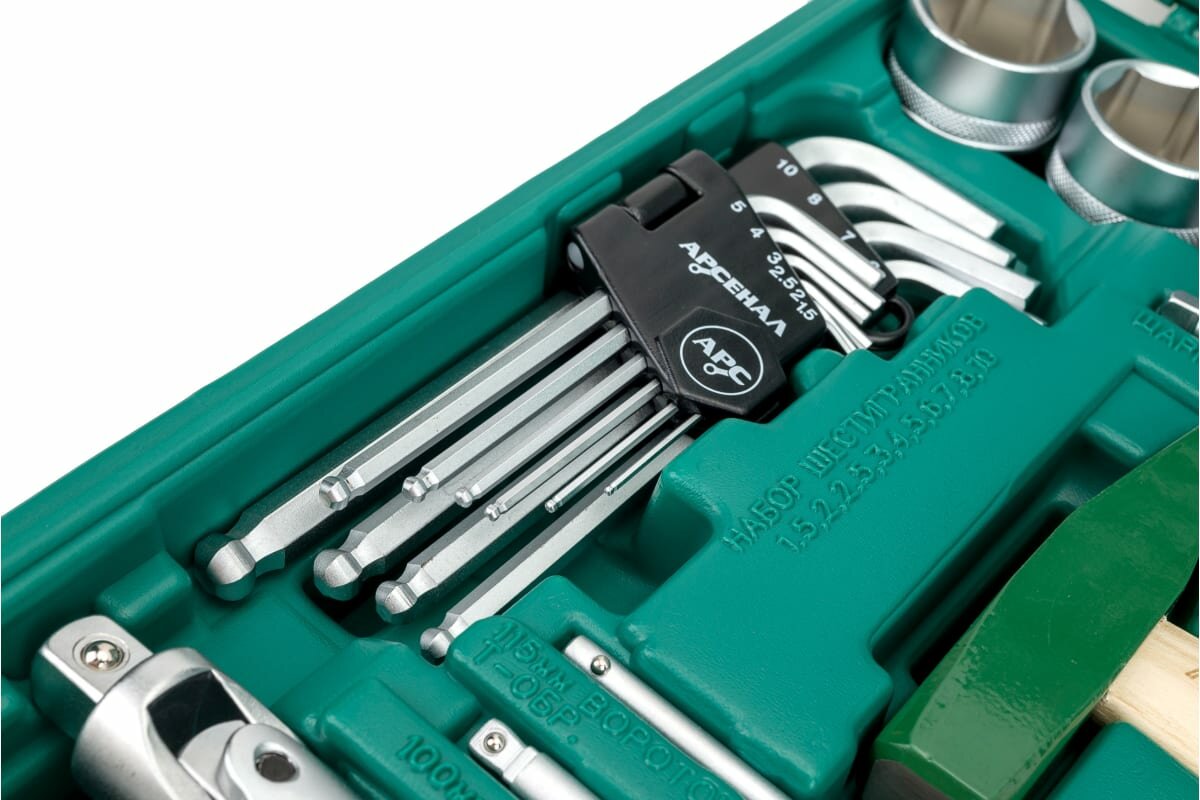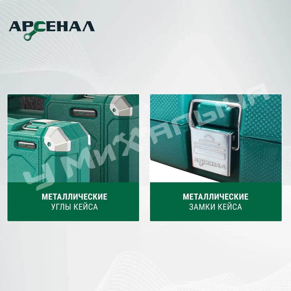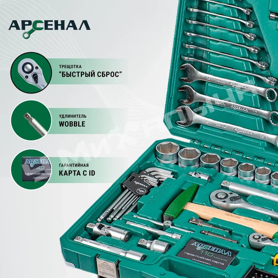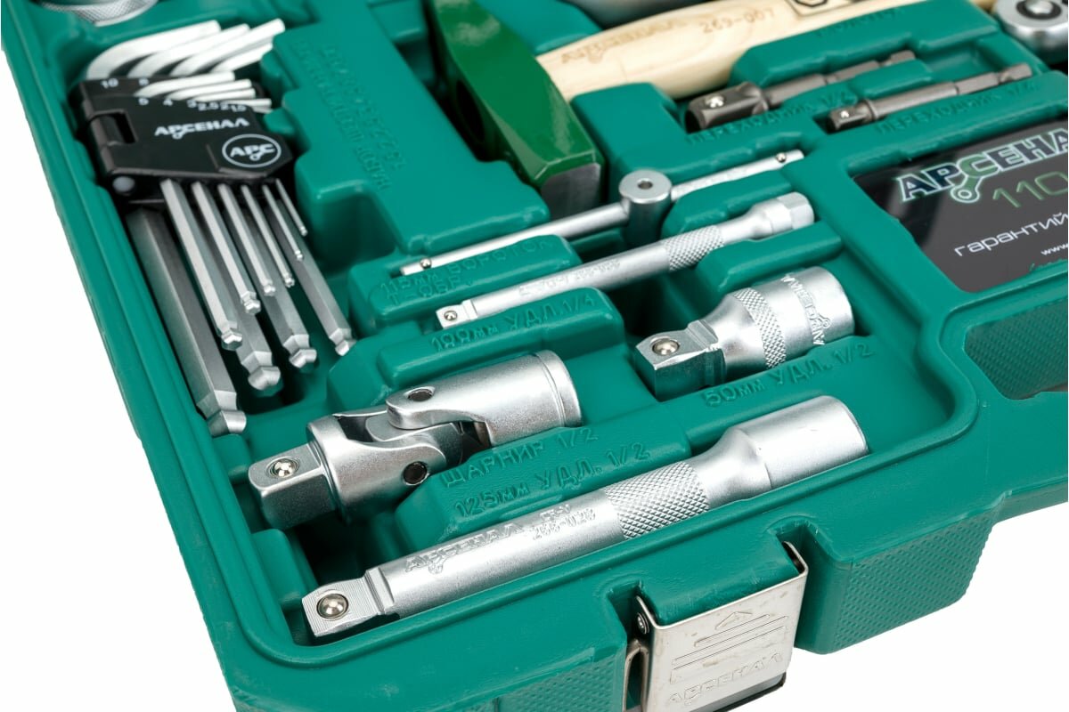Набор инструментов 110 предметов © Арсенал, отличный вариант для профессионалов, расширенная комплектация головок, в том числе глубоких. Большой подбор ключей комбинированных и шестигранных, а еще разводной ключ в качестве ответного. В первую очередь, должны обратить свое внимание на этот набор те, кто хочет иметь большую комплектацию с отличными возможностями самостоятельного ремонта любых улов и агрегатов авто. Биты идут в отдельном кейсе - сложно потерять, удобно переносить. Сталь, из которой изготовлен инструмент, легирована хромом и ванадием с нанесением никелевого покрытия. Крепкий кейс с металлическими углами выдержит ударные нагрузки. Наборы инструментов Арсенал имеют пожизненную гарантию. Арсенал - всегда качественный инструмент и надежные кейсы.