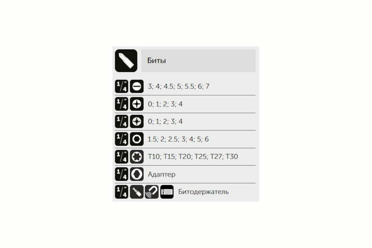 | Биты | SL; PH; PZ; HEX; T(TX) |