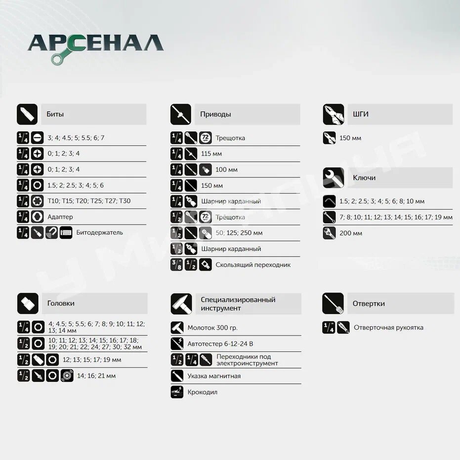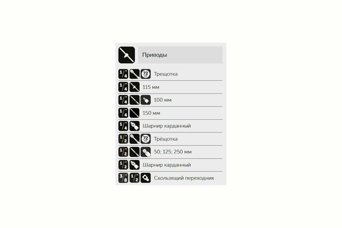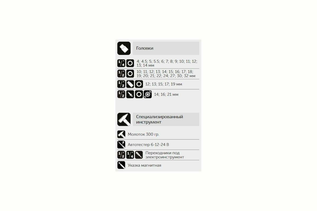 | Комплектация | вороток для головок; ключи гаечные; рукоять для бит; трещотка; головки со вставками; торцевые головки; переходник для головок; удлинитель для головок; шарнир карданный для головок; бита-адаптер для торцевых головок |