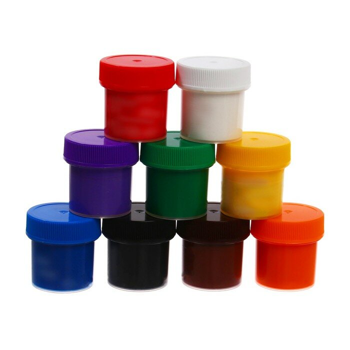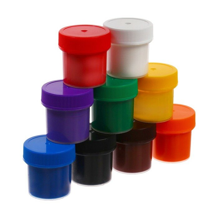 Гуашь в баночках с надёжной, цветной винтовой крышкой.
