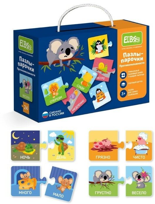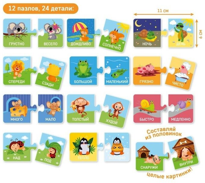 Пазл парочки «Противоположности» состоит из 24 деталей. Малышу нужно составить 12 занимательных картинок с разными животными. На каждом рисунке имеется изображение двух животных одного вида, которые чем-то отличаются друг от друга. Ребенку предстоит объяснить, чем они не похожи, в чем они противоположны. Это увлекательное задание позволит малышу получить новые знания, расширить кругозор. В процессе игры ребенок познакомится с такими понятиями, как «большой-маленький», «верх-низ», «веселый-грустный» и другие. Кроме того у ребенка будет развиваться мелкая моторика рук, внимательность и усидчивость.