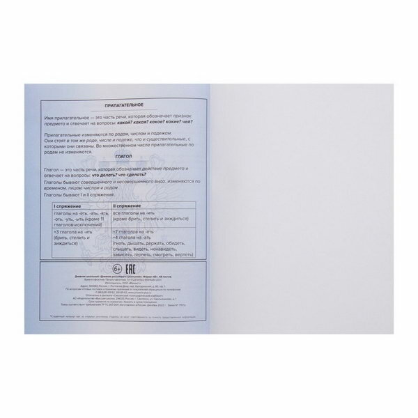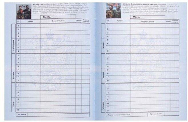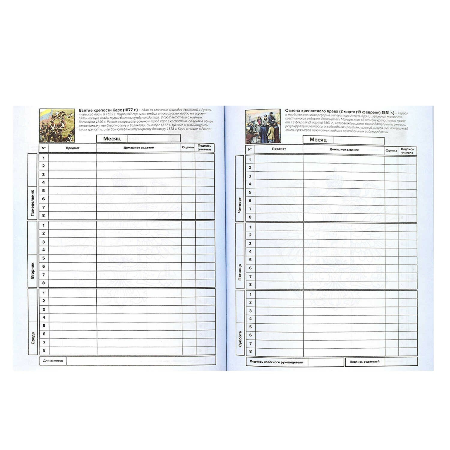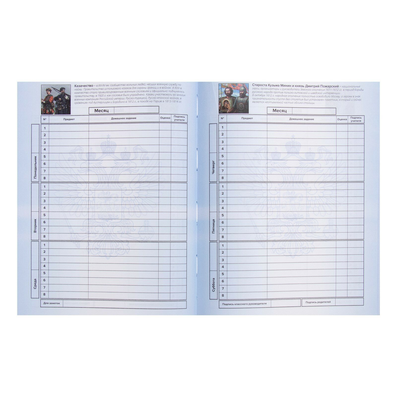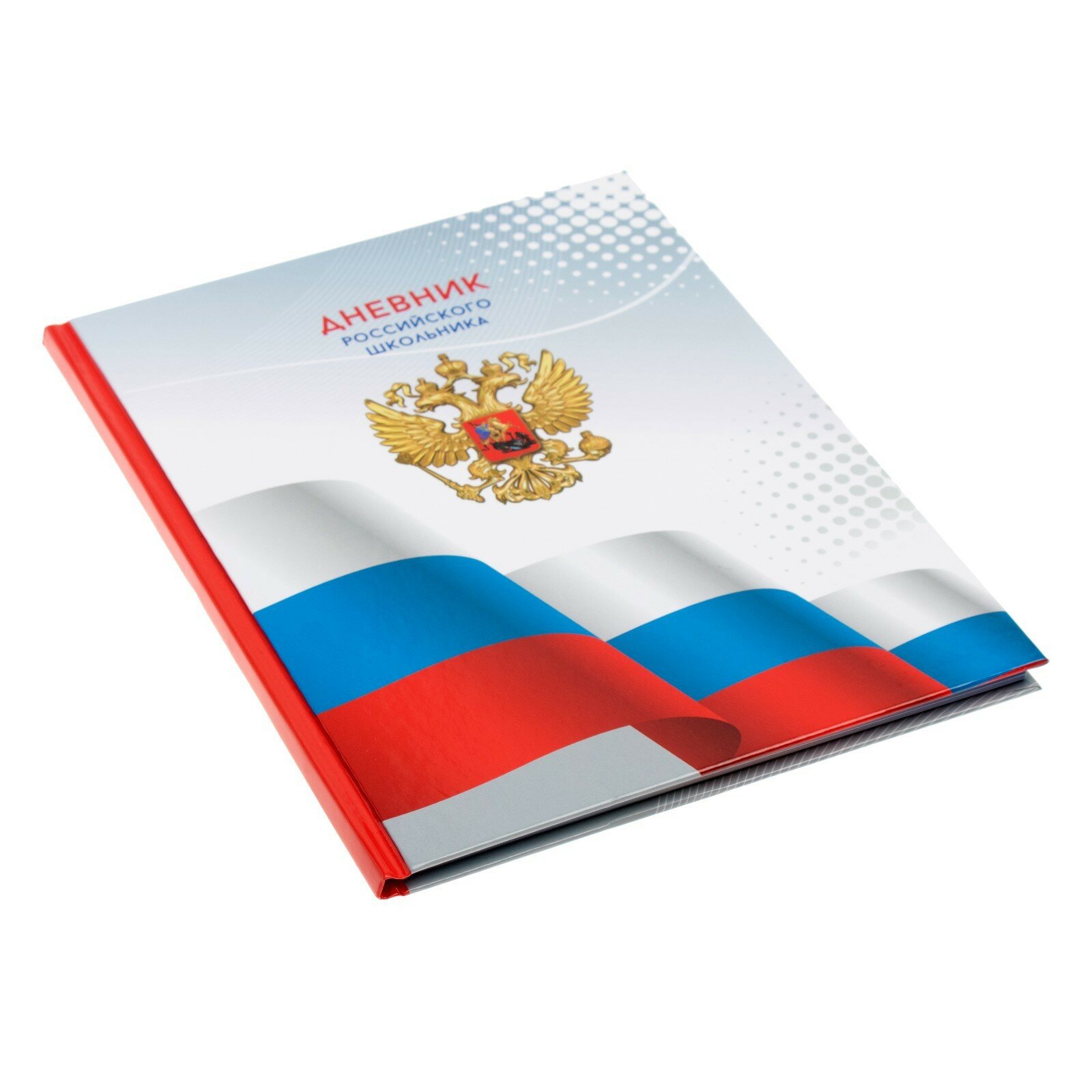 Дневник российского школьника, формат А5+, 48 л., твёрдый переплёт. полноцветная печать, глянцевая ламинация, красочность форзаца: полноцветная печать, красочность блока: полноцветная печать. Блок: бумага - белый офсет, 65 г/м?, универсальная шпаргалка.
