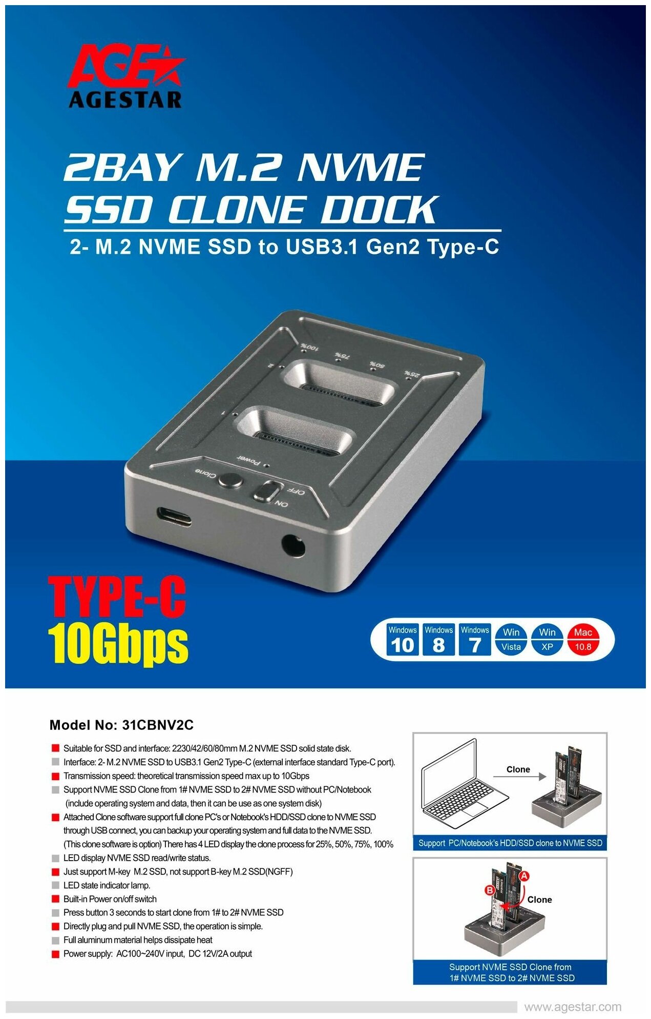 Док-станция SSD AgeStar 31CBNV2C серый, интерфейс дисков NVMe, интерфейс подключения USB3.1, питание от сети переменного тока/от USB, материал корпуса: алюминий
