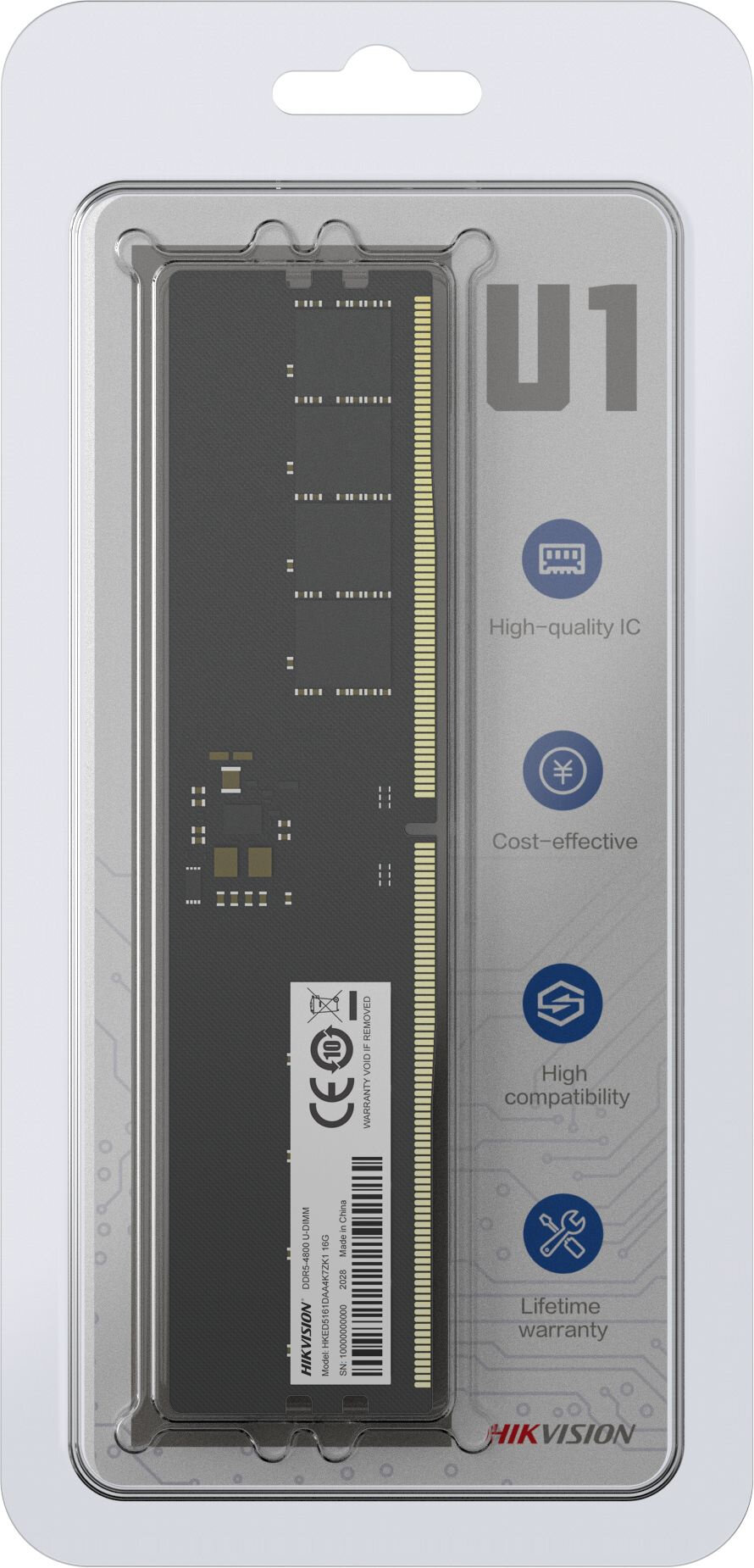 Модуль памяти Hikvision U1 HKED5161DAA4K7ZK1/16G, объем 1 х 16Gb, форм-фактор DIMM 288-pin, тип памяти DDR5, рабочая частота 4800MHz, unbuffered