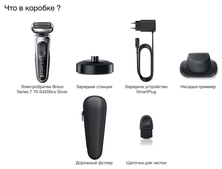 | Комплект поставки | Электробритва Braun, Зарядная станция, Зарядное устройство SmartPlug, Насадка-триммер, Дорожный футляр, Щеточка для чистки |