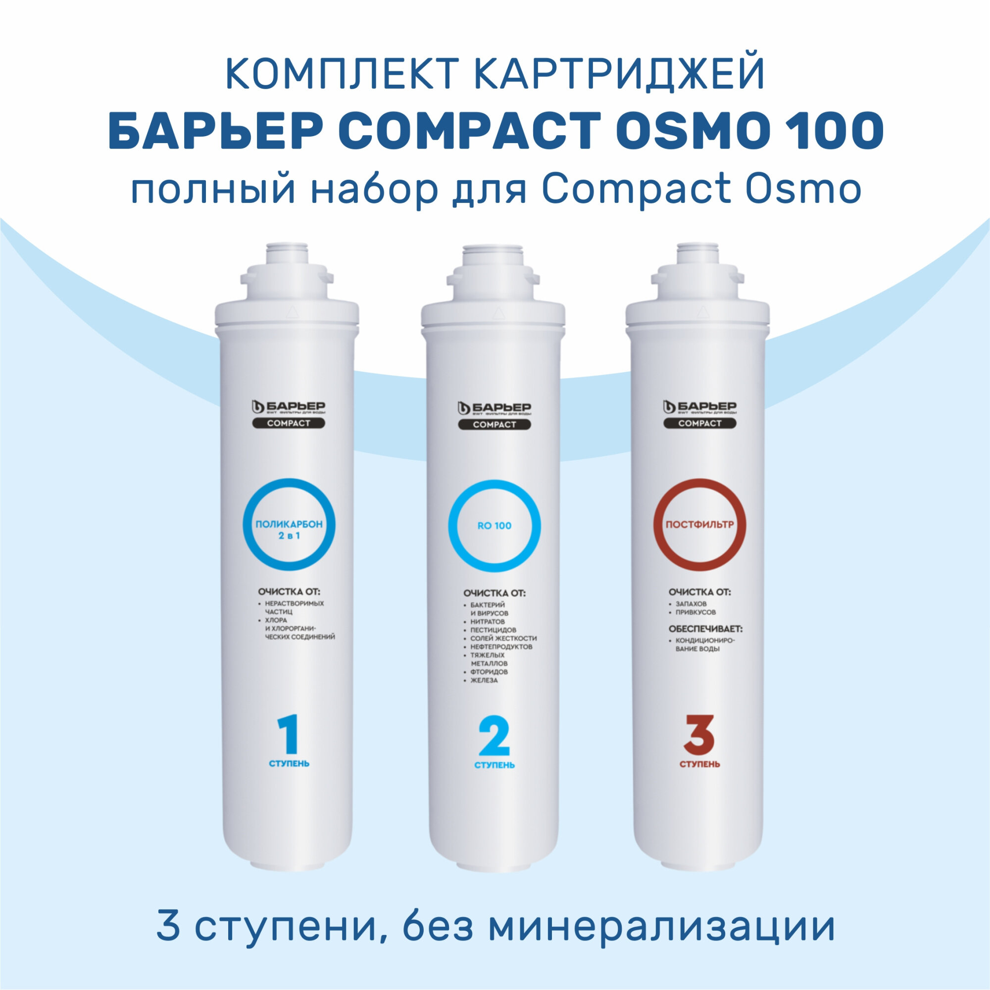 | Описание | В комплект входят1 ступеньCompact Поликарбон 2 в 1. 2 ступеньCompact RO 100. 3 ступеньCompact Постфильтр. |
