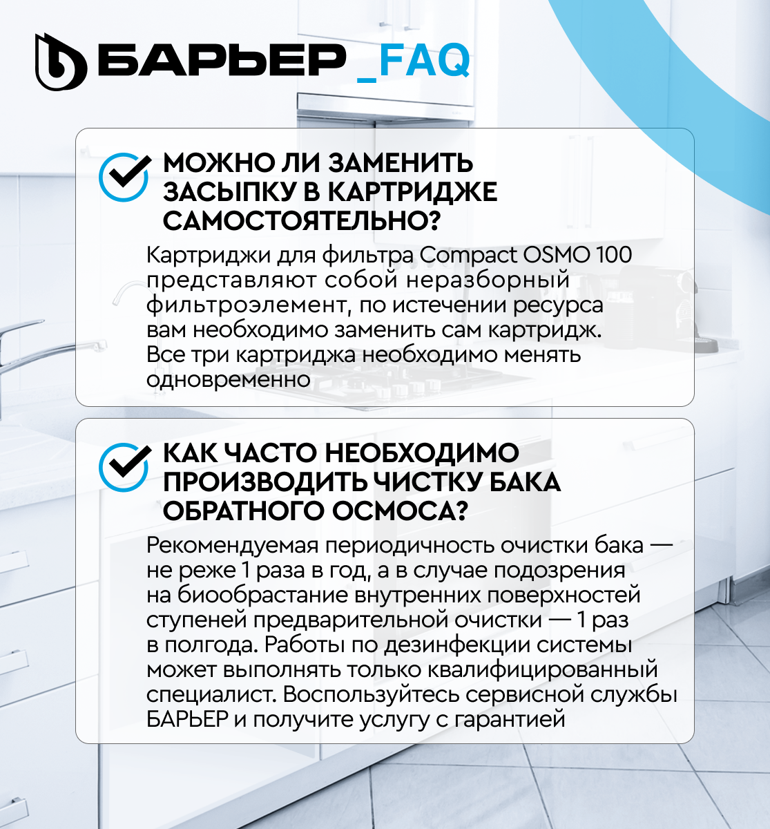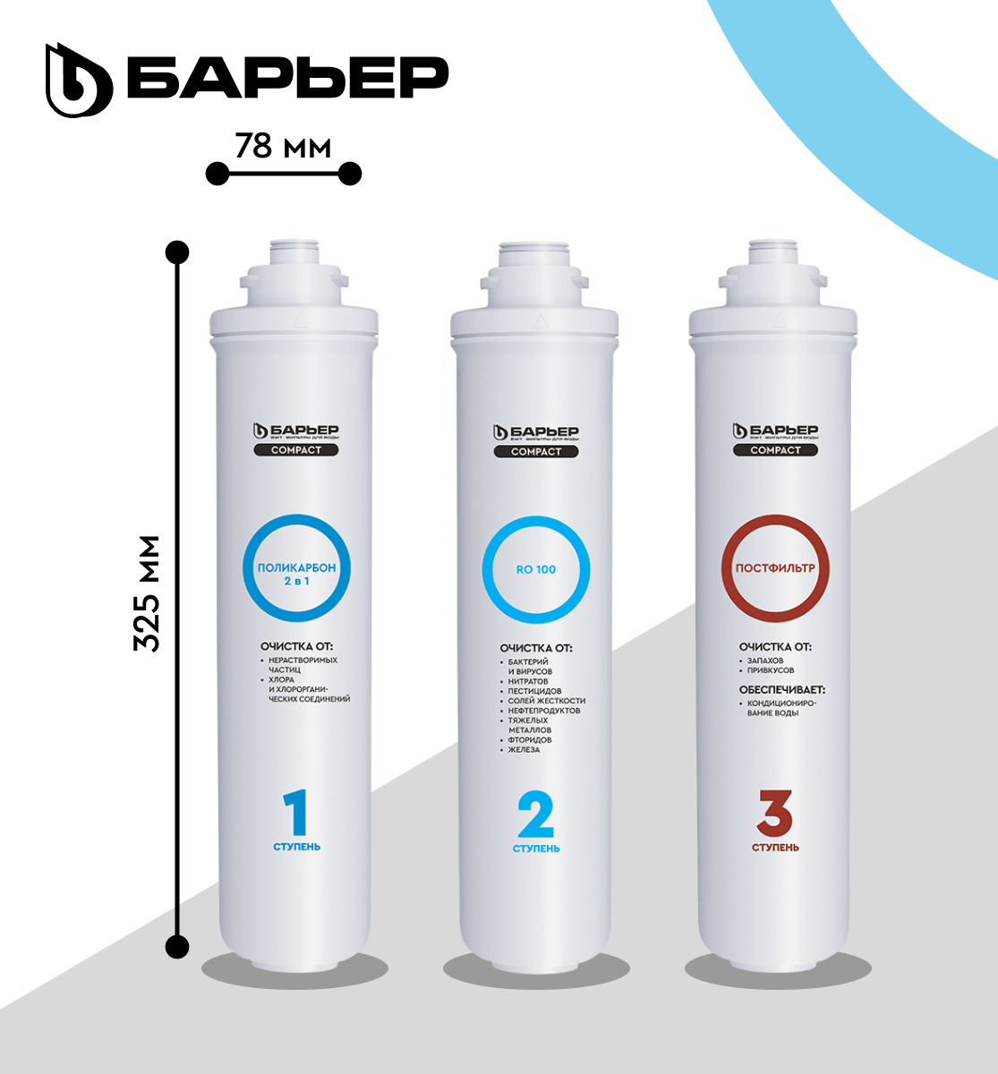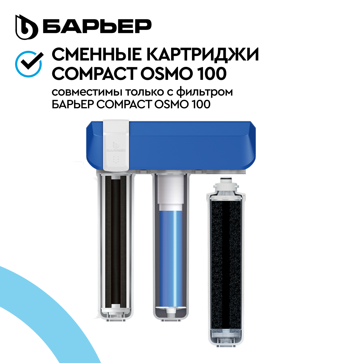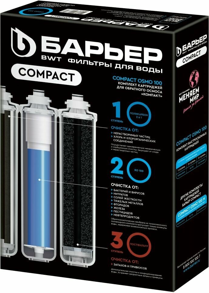**Система обратного осмоса Барьер Compact OSMO 100** - компактная трёхступенчатая обратноосмотическая система, соответствующая по эффективности классическому пятиступенчатому осмосу.