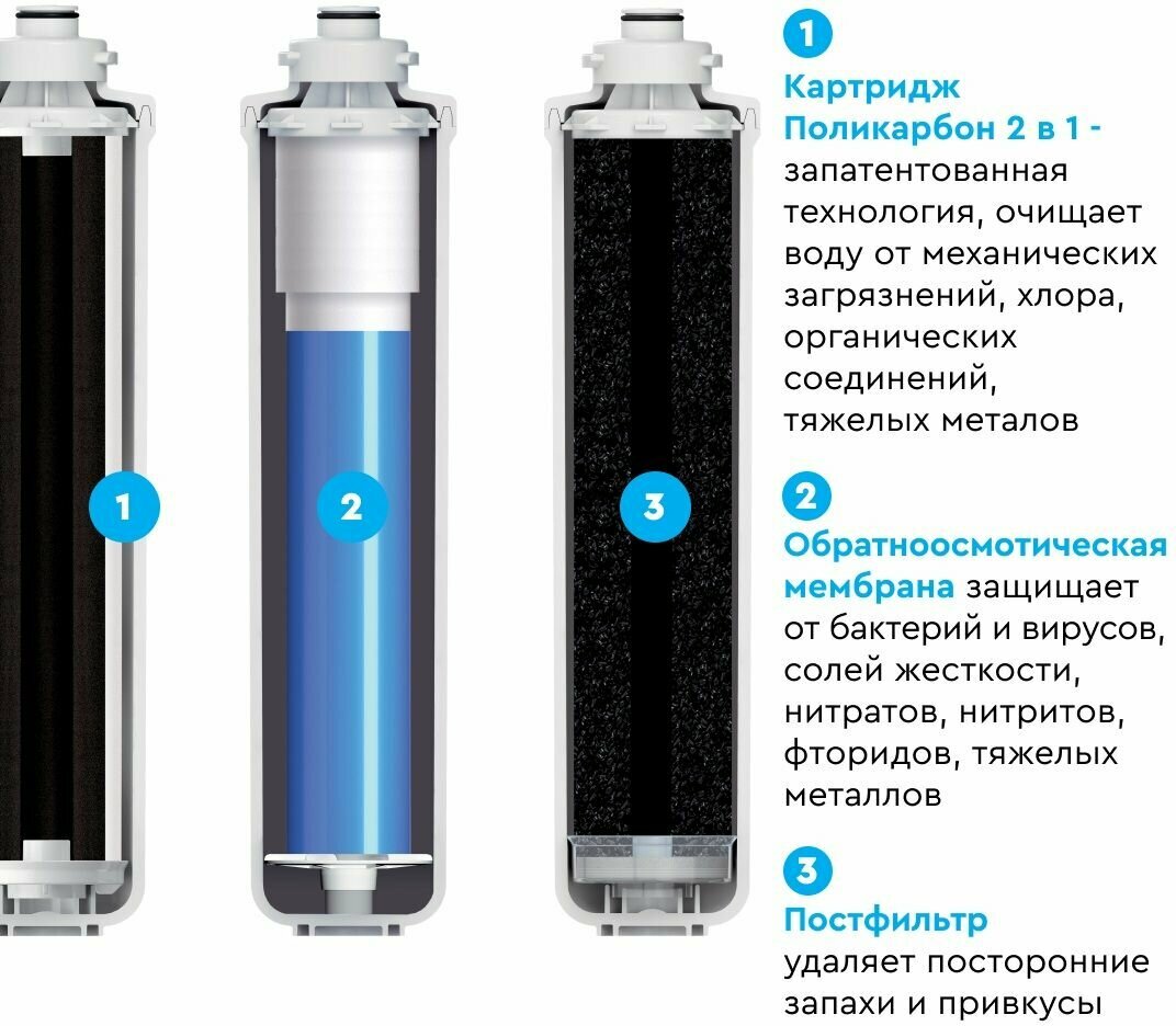 - 3 ступень: Постфильтр – Картридж дополнительной очистки и кондиционирования воды с помощью активированного кокосового угля. Устраняет неприятные привкусы, запахи, остаточные тяжелые металлы и хлор.