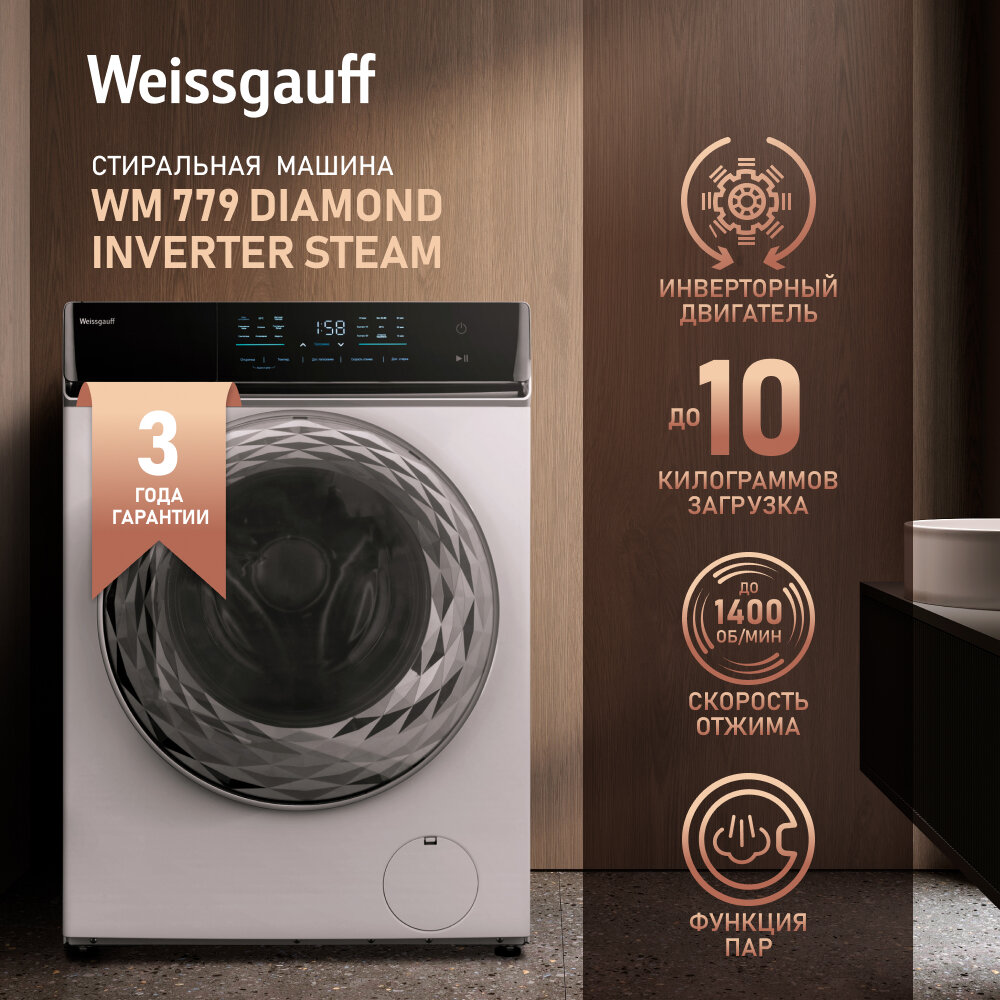 Стиральная машина Weissgauff WM 779 Diamond Inverter Steam белый корпус, серый люк, фронтальная загрузка до 10кг, максимальная скорость отжима 1400об/мин, класс энергопотребления B (430999)