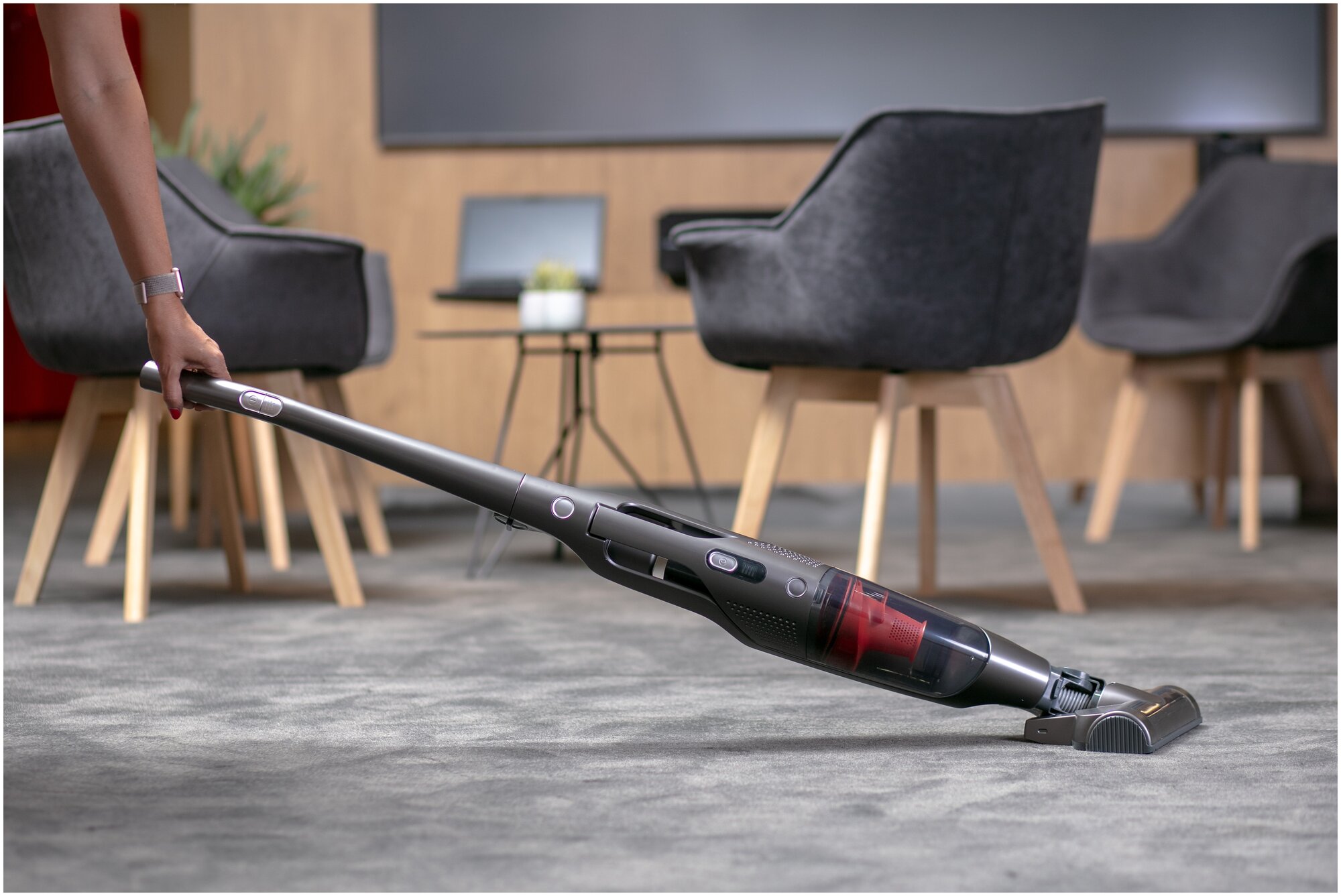 Это автономный пылесос. Не нужно его парковать на зарядной станции. Удобная складная ручка позволяет убрать пылесос на хранение в небольшой шкафчик, а отсоединенный аккумулятор можно заряжать где угодно. Одним движением откройте защелку, отсоедините контейнер и вытряхните пыль. Контейнер устанавливается на место в считанные мгновения.