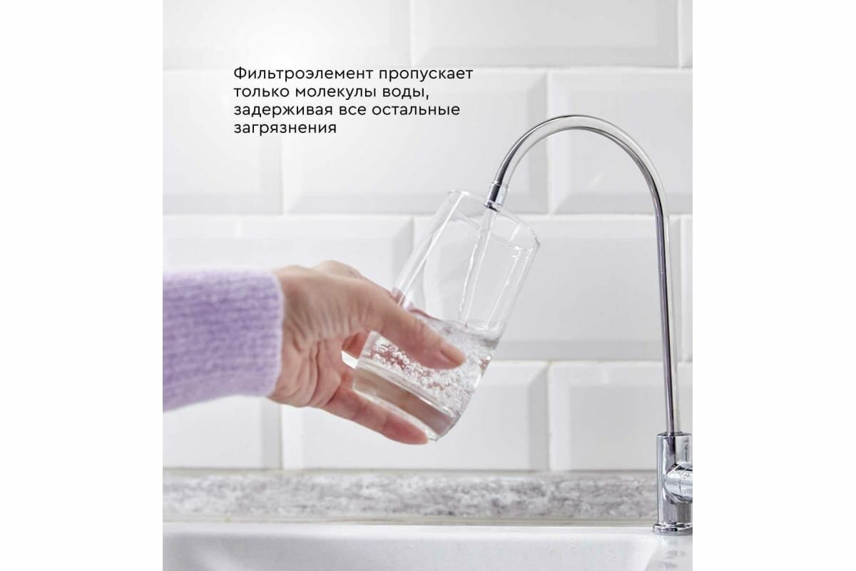 Очищает воду от примесей на 99,9% от большинства известных загрязнений на молекулярном уровне, пропуская ее под давлением через мельчайшие поры, что позволяет проводить очистку от различных солей, хлоридов, фторидов, сульфатов, нитратов, ионов металлов, высокомолекулярных органических соединений, а также от различных микроорганизмов.