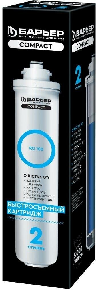 **Фильтроэлемент БАРЬЕР RO 100** используется в качестве второй ступени в системах обратного осмоса БАРЬЕР Compact OSMO 100 и БАРЬЕР Compact OSMO 100M.