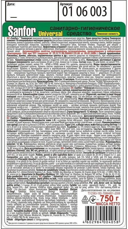 Одно средство Санфор Универсал заменит 10 специальных чистящих средств для разных поверхностей и областей применения: легко и быстро отчистит раковины, ванны и душевые кабины, унитазы, сливы и водостоки, керамическую плитку, любые твердые моющиеся напольные покрытия, настенные панели, моющиеся обои, бытовую технику. Подходит для уборки и дезинфекции туалетов для животных. Эффективно устраняет серый налет, плесень, жир, мыльные потеки, въевшиеся пятна от продуктов питания и другие загрязнения. Благодаря загущенной формуле экономичен в расходе. Обеспечивает свежий запах. Обладает антимикробными* свойствами.