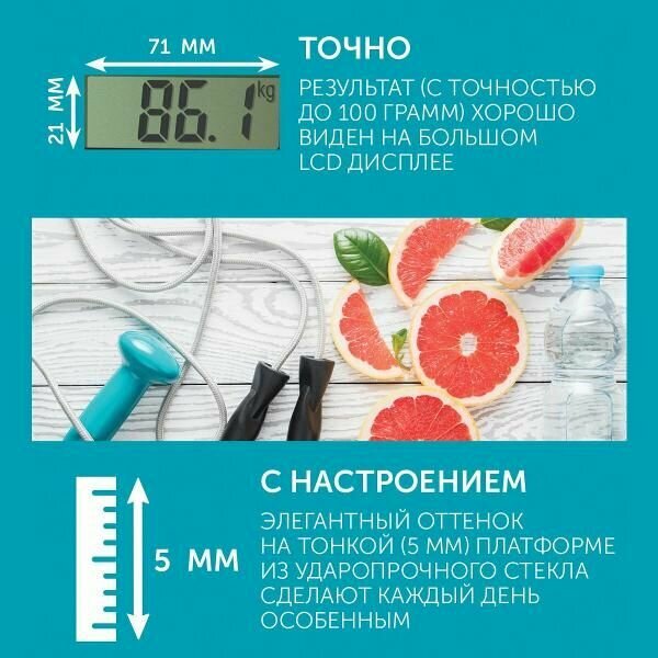 Напольные весы - это простой и удобный способ контролировать свой вес. Благодаря высокочувствительным датчикам погрешность составит не более одной цены деления: 100 г. Ультратонкий дизайн обеспечит компактное хранение. Автоматическое включение и выключение позаботятся об экономном расходе заряда батареи. Индикатор перегрузки и индикатор батарейки обеспечат комфортную эксплуатацию. А приятное цветовое решение и яркая композиция позволят прибору не только вписаться в любой интерьер, но и радовать глаз каждый день. Предназначены для взвешивания. Максимальная нагрузка: 180 кг; Цена деления: 100 г; Материал платформы: стекло; Питание: 1 батарейка CR2032 (в комплекте); Дизайн: Лазурный блеск.