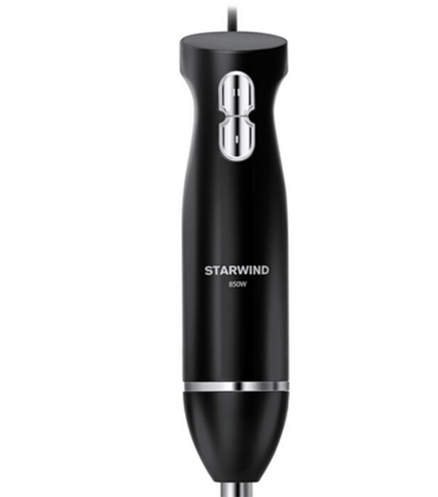 Мощность мотора Starwind SBP2200 составляет 850 Ватт – это гарантия того, что он справится даже с плотными продуктами. Для удобства мощность разбита на две скорости, для их переключения служит единственный интуитивный орган на рукоятке устройства – кнопка из двух частей. Благодаря ей смесь во время готовки можно довести до необходимого состояния.
