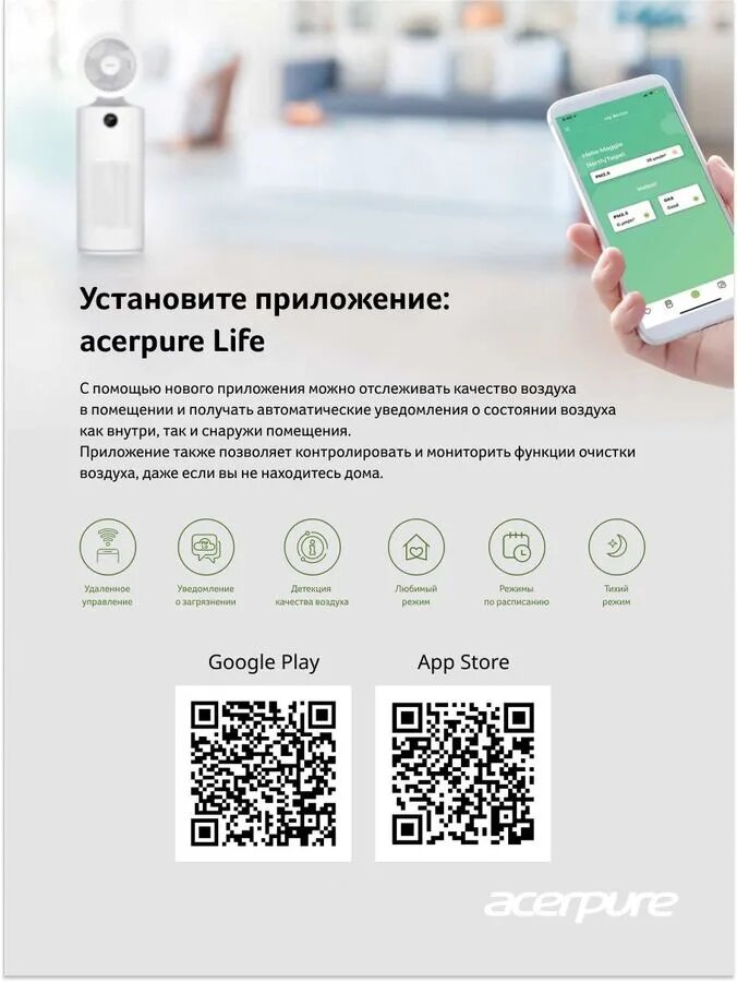 Циркулятор и очиститель воздуха 2-в-1 доставляет отфильтрованный свежий воздух в каждый уголок дома. Четырехслойная система фильтров HEPA H13 4 в 1 с активированным углем, задерживает до 99 % переносимых по воздуху бактерий, ультрадисперсной пыли и аллергенов. Фильтр HEPA Plus+ эффективно устраняет 99,99% бактерий и 99% антикоронавирусной (229E) активности вируса гриппа A (H1N1). Расстояние воздушного потока до 12 м. Отрицательные ионы, улавливают сверхтонкую пыль и частицы PM1.0. Современный ЖК-дисплей отображает данные о качестве воздуха в режиме реального времени. С помощью мобильного приложения acerpure Life (поддержка IOS и Android), можно контролировать и запускать функции очистки воздуха, даже если вас нет дома. Низкое энергопотребление и высокая производительность за счет двигателя постоянного тока. Бесшумный режим. Замок безопасности от случайных касаний детей или домашних животных.