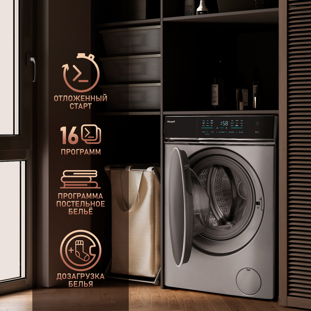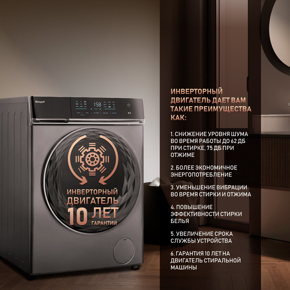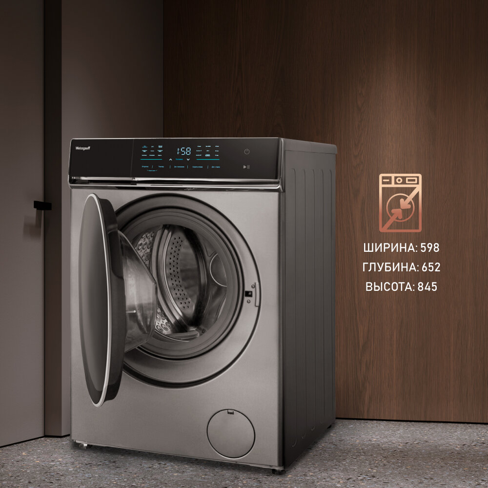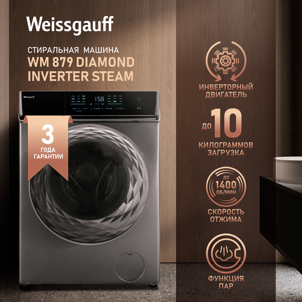 Стиральная машина Weissgauff WM 879 Diamond Inverter Steam серебристый корпус, серый люк, фронтальная загрузка до 10кг, максимальная скорость отжима 1400об/мин, класс энергопотребления B (431000)