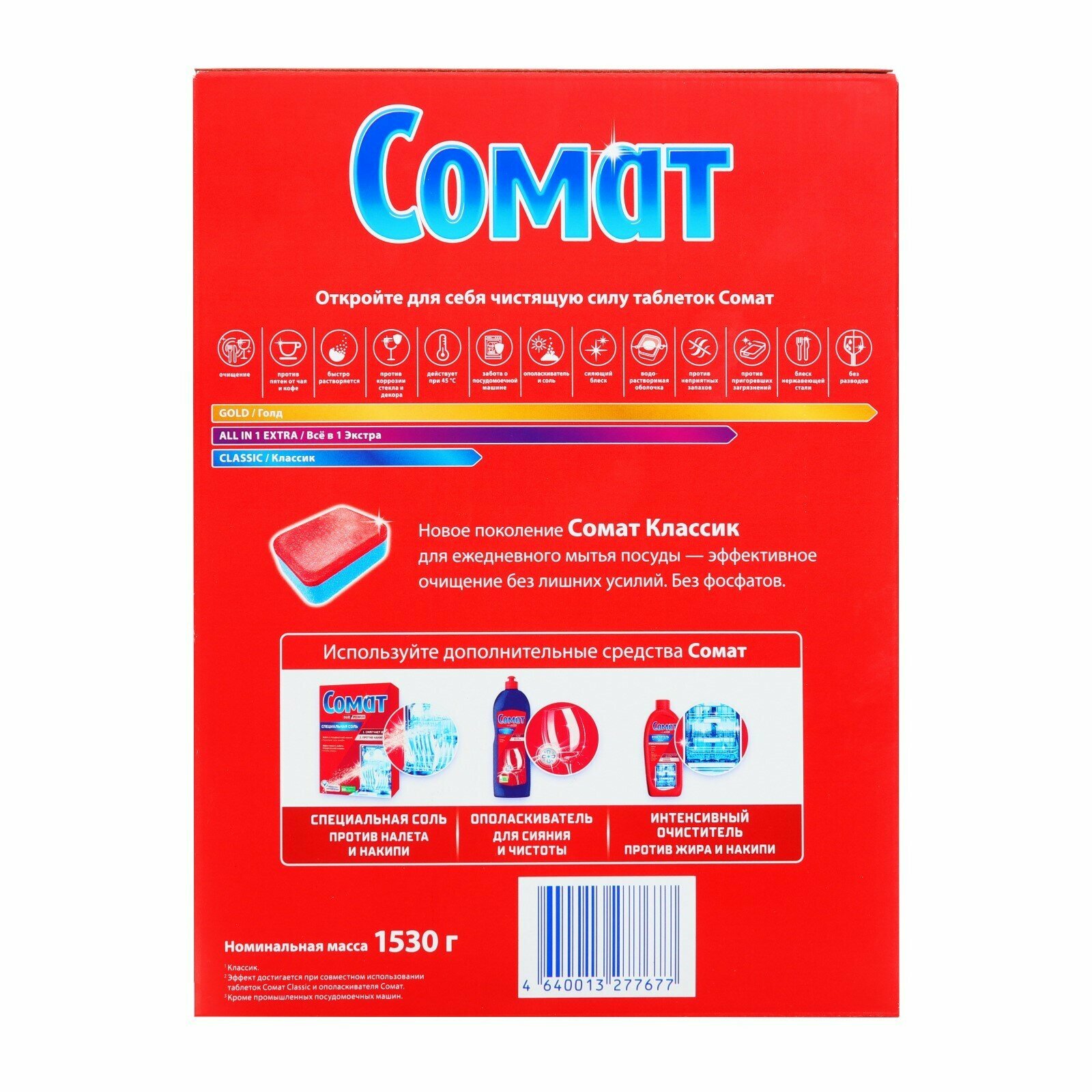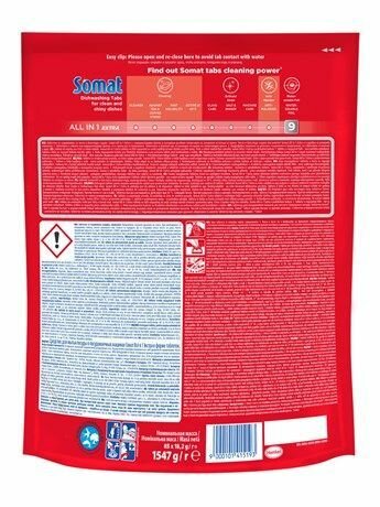 Таблетки Somat очень удобно дозировать. С ними Вам больше не придётся расходовать лишнее количество средства. Даже если времени не так много, и Вам нужно запустить короткий цикл в посудомоечной машине, Somat отлично отмоет всю посуду. Таблетки заботятся не только о бытовой технике и столовых принадлежностях, но и о Вашем здоровье. Водорастворимая оболочка не оставляет ни единого следа на посуде.