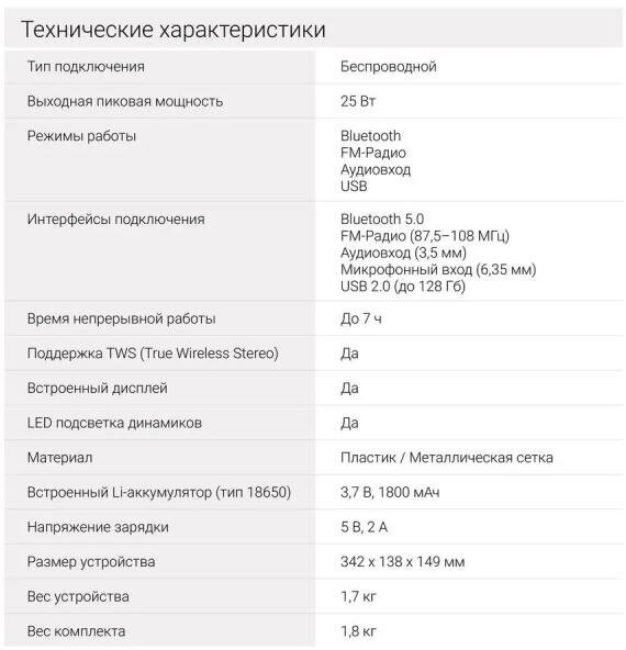 | Выходная мощность (RMS) | 25 Вт |