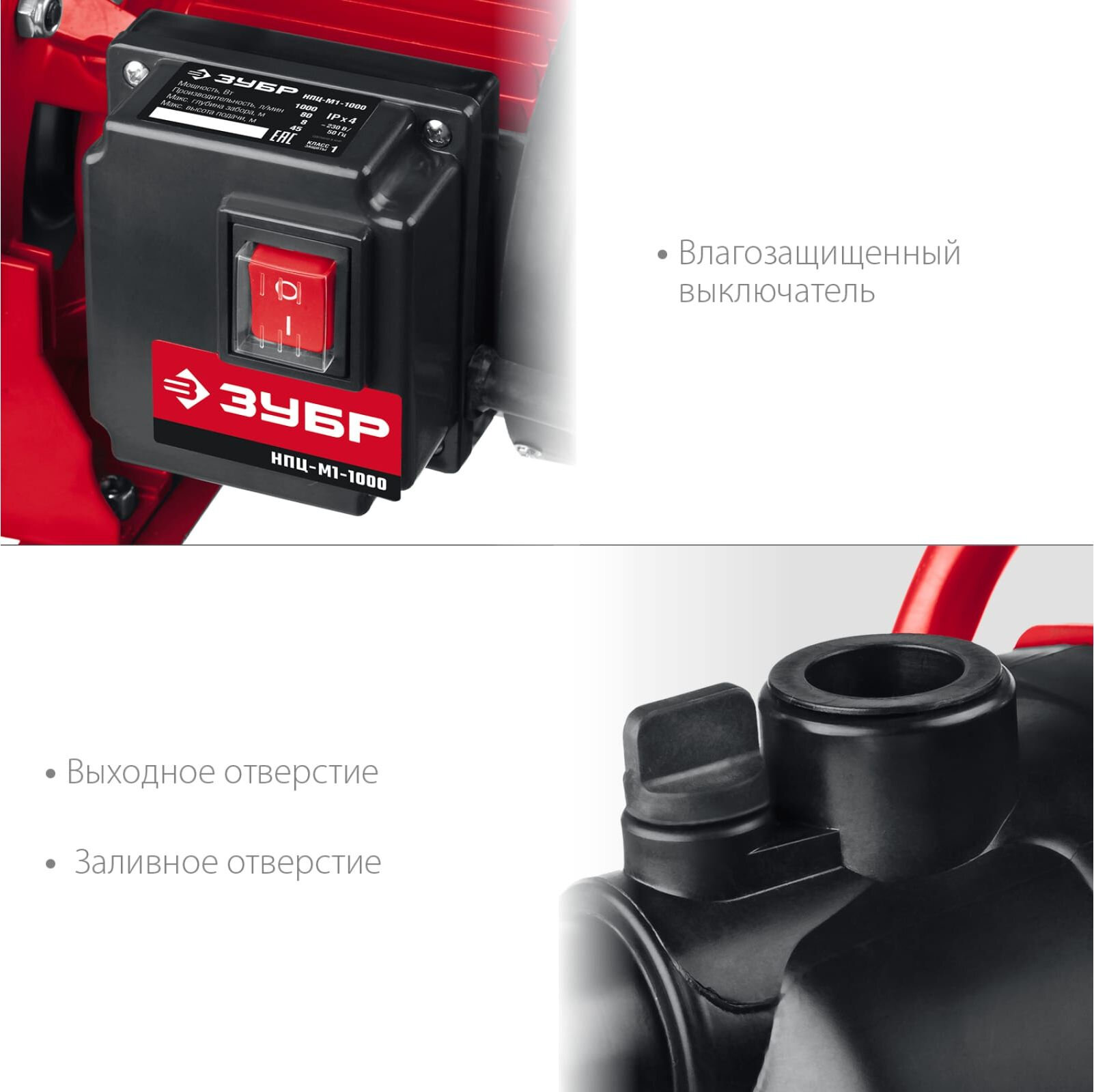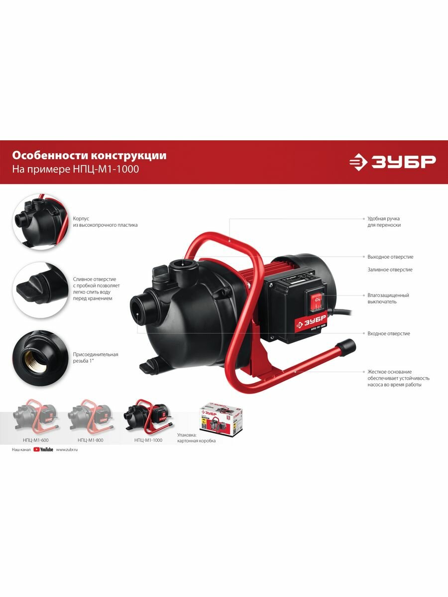 Поверхностный насос Зубр НПЦ-М1-800 выполнен в пластиковом корпусе и работает по центробежному принципу. Верхняя грань оснащена удобной ручкой для переноски, а для правильной установки предусмотрены ножки на нижней стороне. Простая конструкция обладает высокой надежностью при использовании в соответствующих условиях.