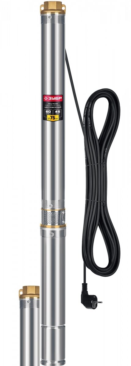 ЗУБР НСЦ-75-60 это скважинный насос с рабочим напором до 60 метров. Модель предназначена только для чистой воды и поставляется в комплекте с 35-метровым силовым кабелем. Обмотка двигателя насоса изготовлена из меди, а для производства выходного патрубка использовалась латунь. Также центробежный насос оснащен конденсатором.
