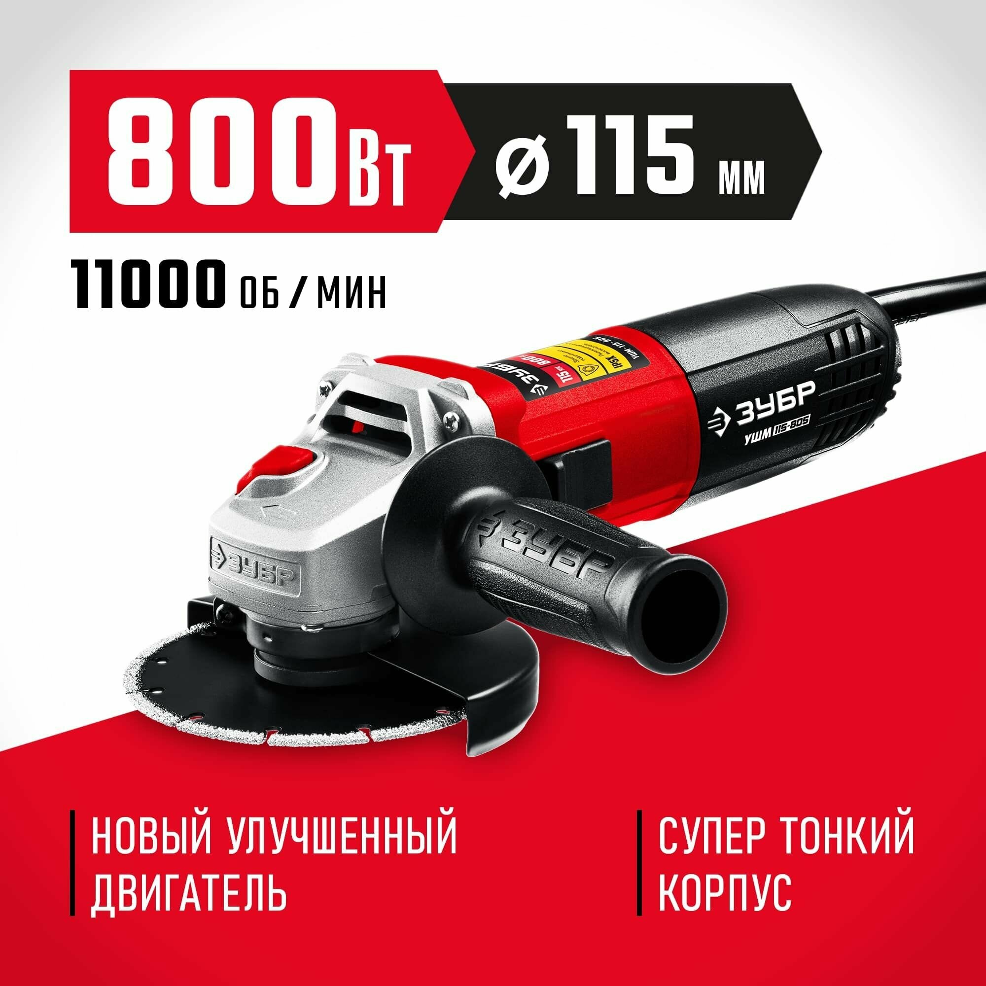 Угловая шлифовальная машина ЗУБР 115 мм, 800 Вт УШМ-115-805 предназначена для зачистки, шлифовки и резки металлов, обработки бетона и камня при установке соответствующих шлифовальных, отрезных, алмазных кругов.