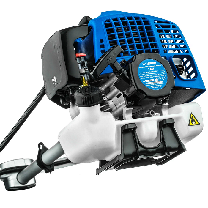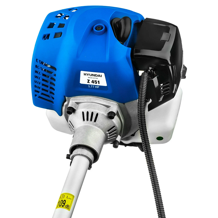 | Прочие особенности и свойства | Триммер бензиновый Hyundai Z 451 оснащен 2-тактным двигателем с мощностью 1.7 л. с. с праймером для моментального запуска. Инструмент работает на простой смеси из масла и бензина АИ92, поэтому не требует долгого простоя в работе. Бак на 920 мл позволяет за 1 сеанс скашивать траву на всем участке и придомовой территории., Hyundai Z 451 оснащен жестким кожухом для защиты от камней и щепок. Плечевой ремень и Т-образная рукоятка с настройкой высоты облегчают удержание и снижают напряжение со спины. Вы можете использовать катушку с леской 2.8 мм для быстрой обработки больших участков или металлический нож диаметром 25.5 см для легкого срезания крупной травы. |
