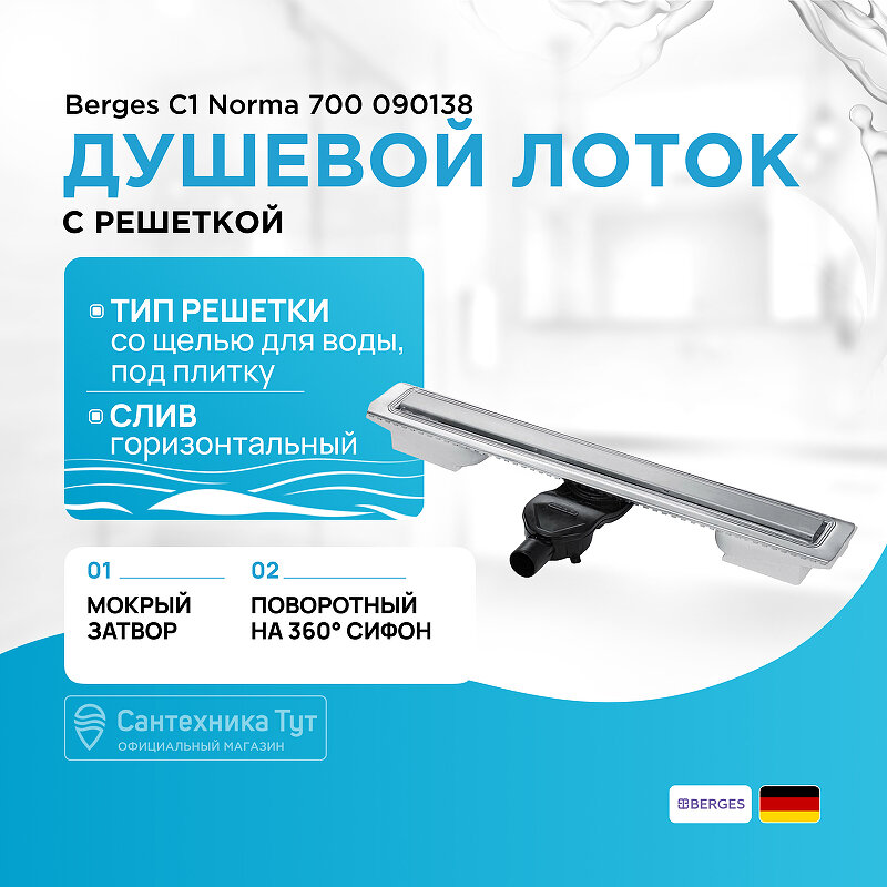 Сервис сравнения цен СкидкаГИД предлагает сравнить цены на товар «Душевой лоток Berges C1 Norma 090138 70 см С1 Norma 090138 напольный L=700 мм, H=60 мм, с нерж реш., решетка матовый хром, гор. слив»