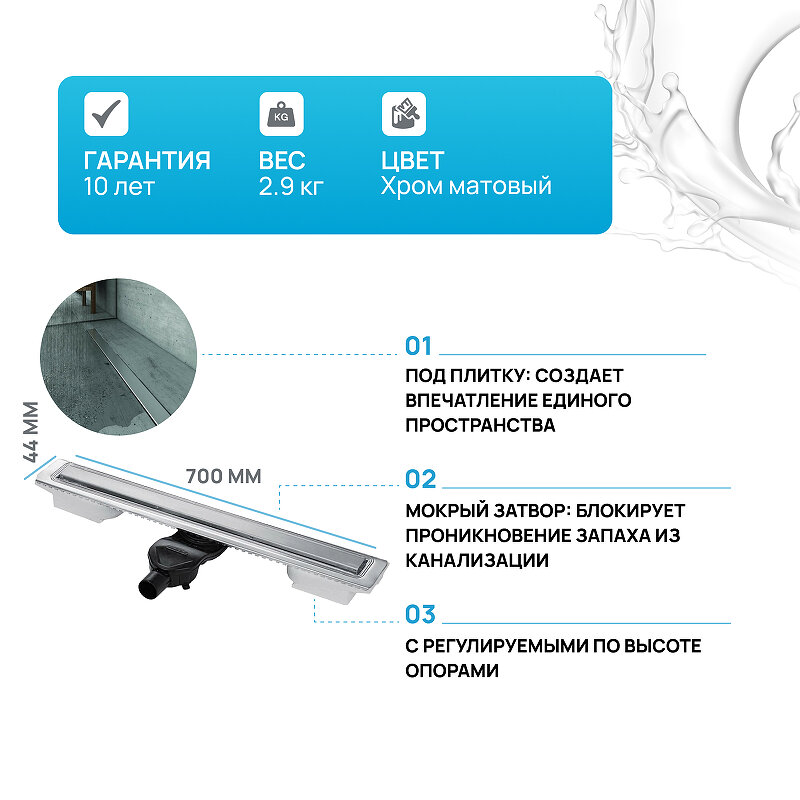 | Комплектация | грязеуловитель; душевой желоб; душевой трап; защитная заглушка; инструкция; компенсатор по высоте; набор креплений; сифон; прокладка гидроизолирующая; решетка |