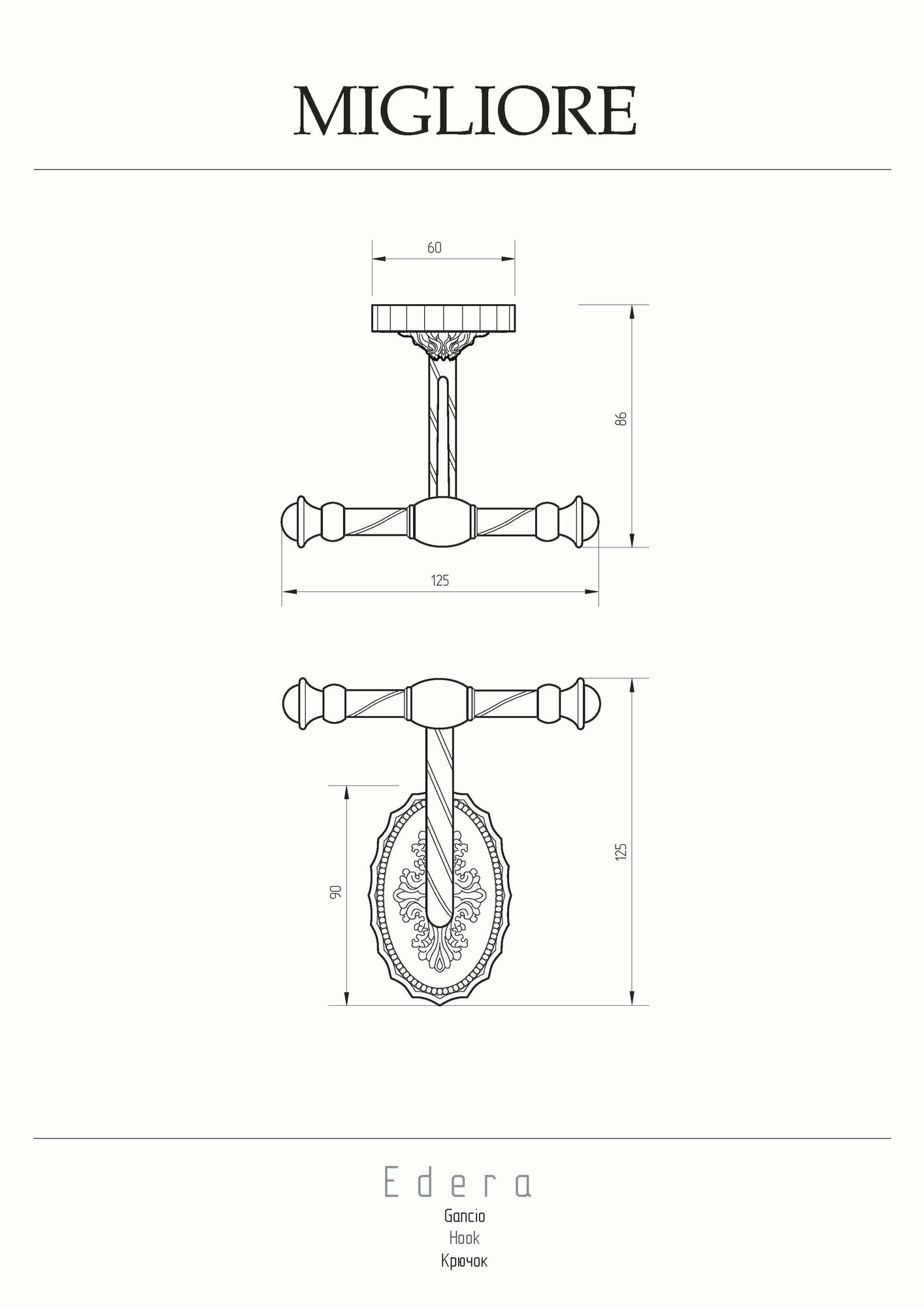 Крючок коллекции EDERA бренда MIGLIORE - самый необходимый предмет, который можно использовать в ванной комнате, на кухне, в корридоре. Благодаря витым элементам и необычной овальной розетке аксессуары коллекции EDERA будут смотреться элегантно и оригинально в классическом интерьере ванной комнаты. Материал — латунь, покрытие цвета бронза. Внимание: бронзовое покрытие достаточно деликатное и для ухода рекомендуется протирать изделие мягкой безворсовой тряпочкой с мыльным раствором и вытирать насухо или использовать чистящее средство бренда MIGLIORE для смесителей и аксессуаров с деликатными покрытиями бронза, золото, медь. Материал: Латунь Оснащение: крепления (шурупы)