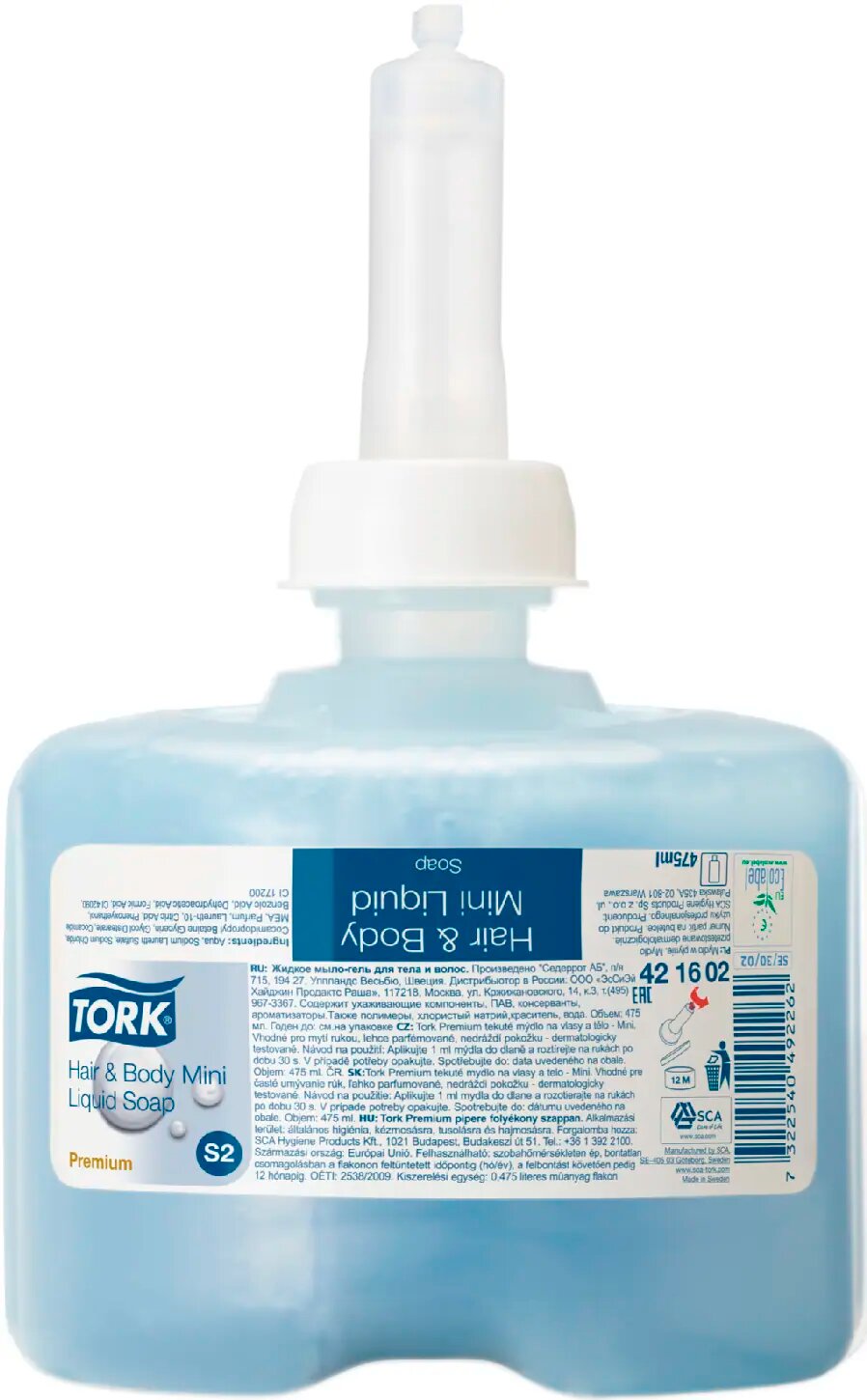 Картридж с жидким мылом-гелем для тела и волос Tork S2 420602 0.475 л (для дозатора арт. 158469). Особенности Жидкое мыло-гель для тела и волос Tork в мини-формате предлагает отелям, школам и спортивным учреждениям все преимущества геля для душа и шампуня в одном эффективном средстве. Имеет мягкий состав, освежающий универсальный аромат, придает коже и волосам мягкость. Для использования в мини-диспенсерах для жидкого мыла Tork. Способ применения Нанести средства на влажные руки и (или) волосы. Аккуратно вспенить и тщательно смыть чистой проточной водой. Вытереть насухо одноразовым бумажным или текстильным полотенцем для рук. Ph 5 Меры предосторожности Промывать глаза теплой водой в течении нескольких минут. Если раздражение не проходит, проконсультироваться с врачом. Состав Смесь воды, поверхностно-активных веществ, ароматизирующих веществ и консервантов. Условия хранения Хранить в сухом и прохладном месте (при температуре не ниже 0°C и не выше 30°C). Срок годности 12 месяцев. Подходит для дозатора: арт. 158