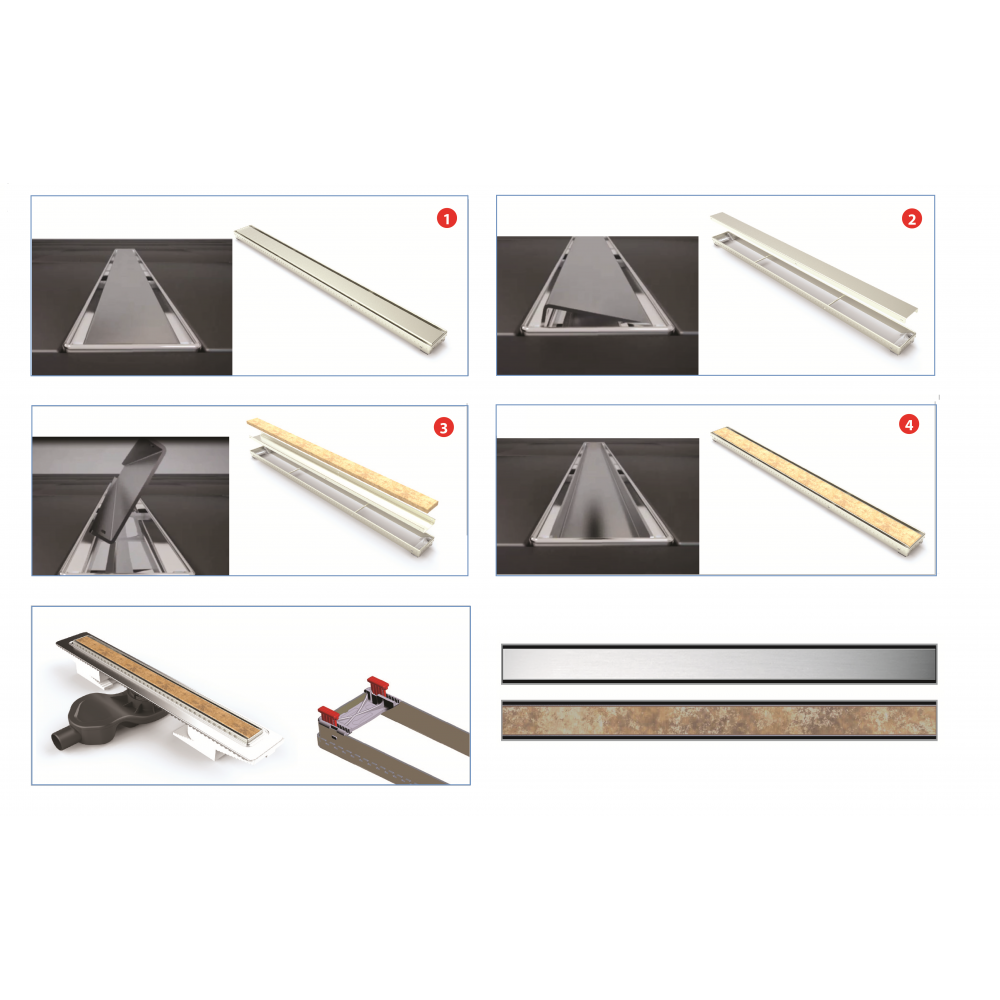- Двусторонняя установка решетки: металл и вклейка плитки с регулировкой по высоте от 8 до 25 мм